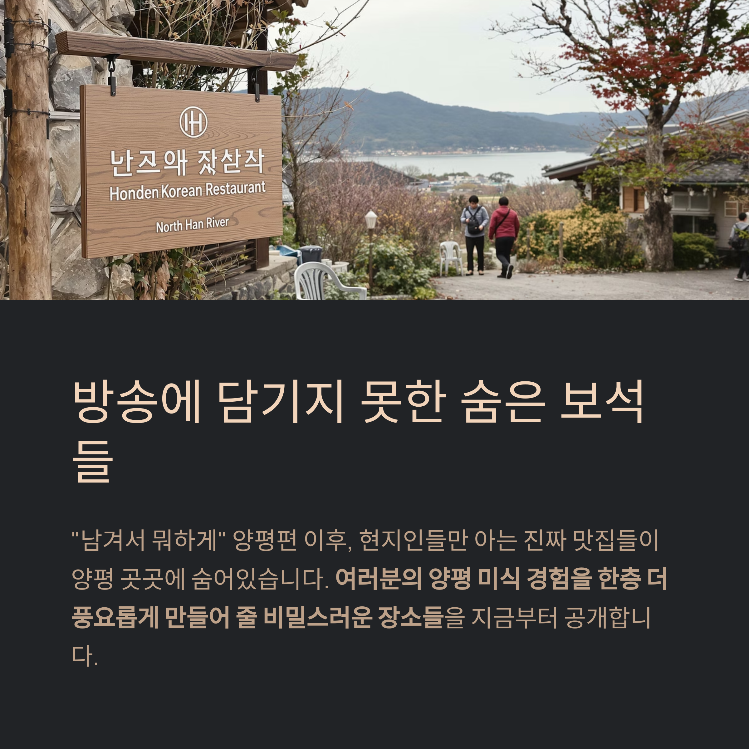 하지만 방송에 다 담기지 못한, 현지인들만 아는 진짜 숨은 맛집들이 양평 곳곳에 보석처럼 숨어있습니다.