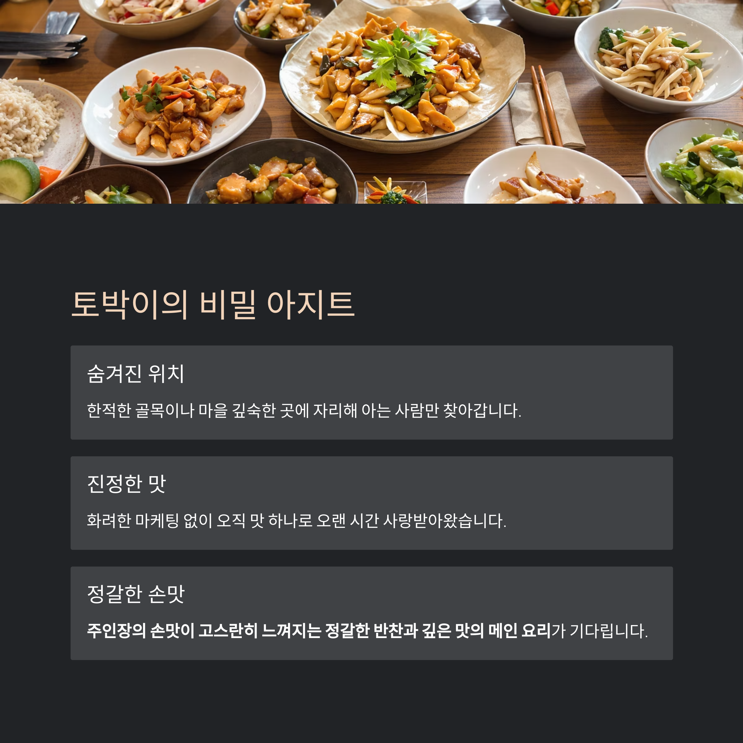 주인장의 손맛이 고스란히 느껴지는 정갈한 반찬과 깊은 맛의 메인 요리는 잊을 수 없는 감동을 선사합니다.
