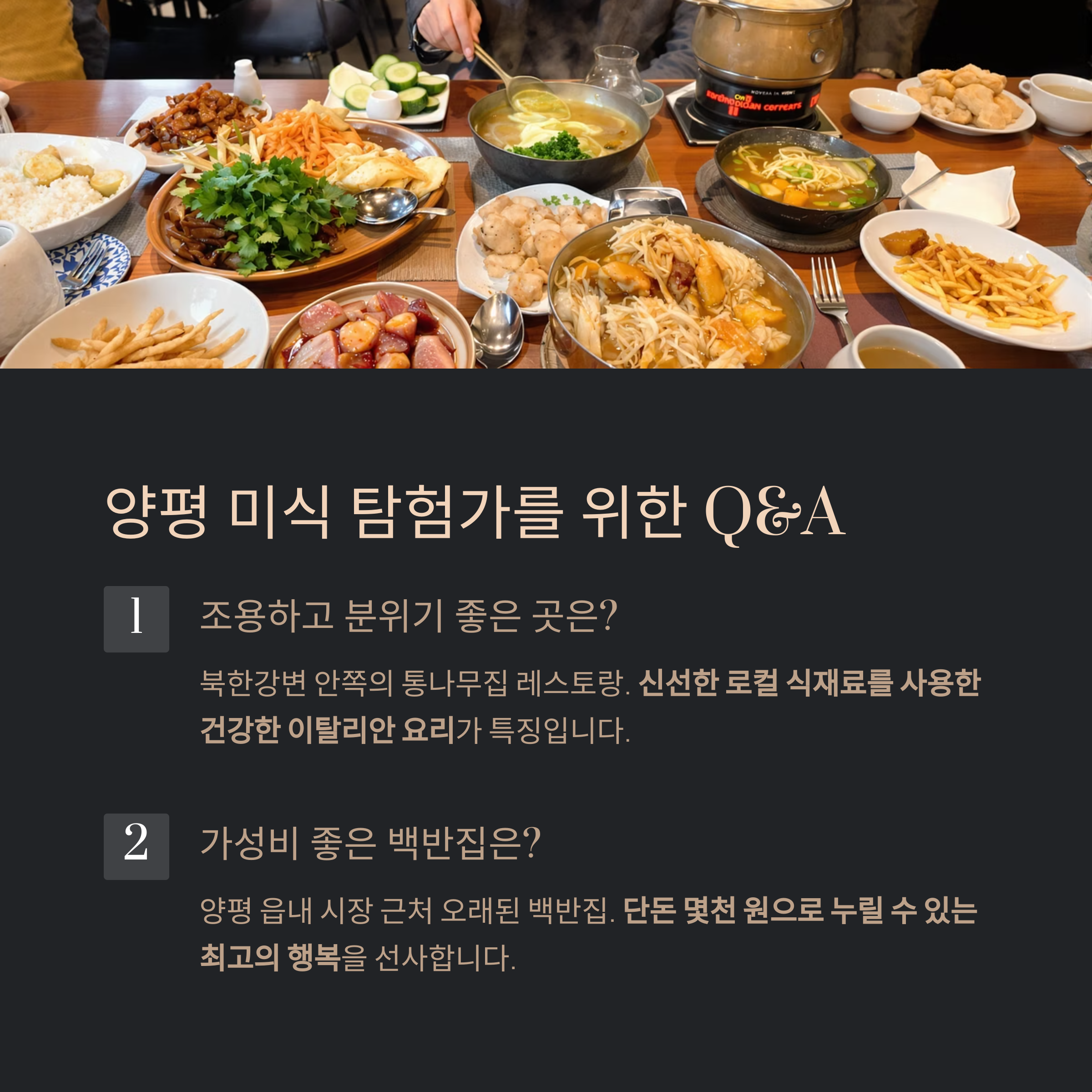 Q: 양평에서 정말 조용하고 분위기 좋은 숨은 맛집을 찾고 싶어요. 어디가 좋을까요?