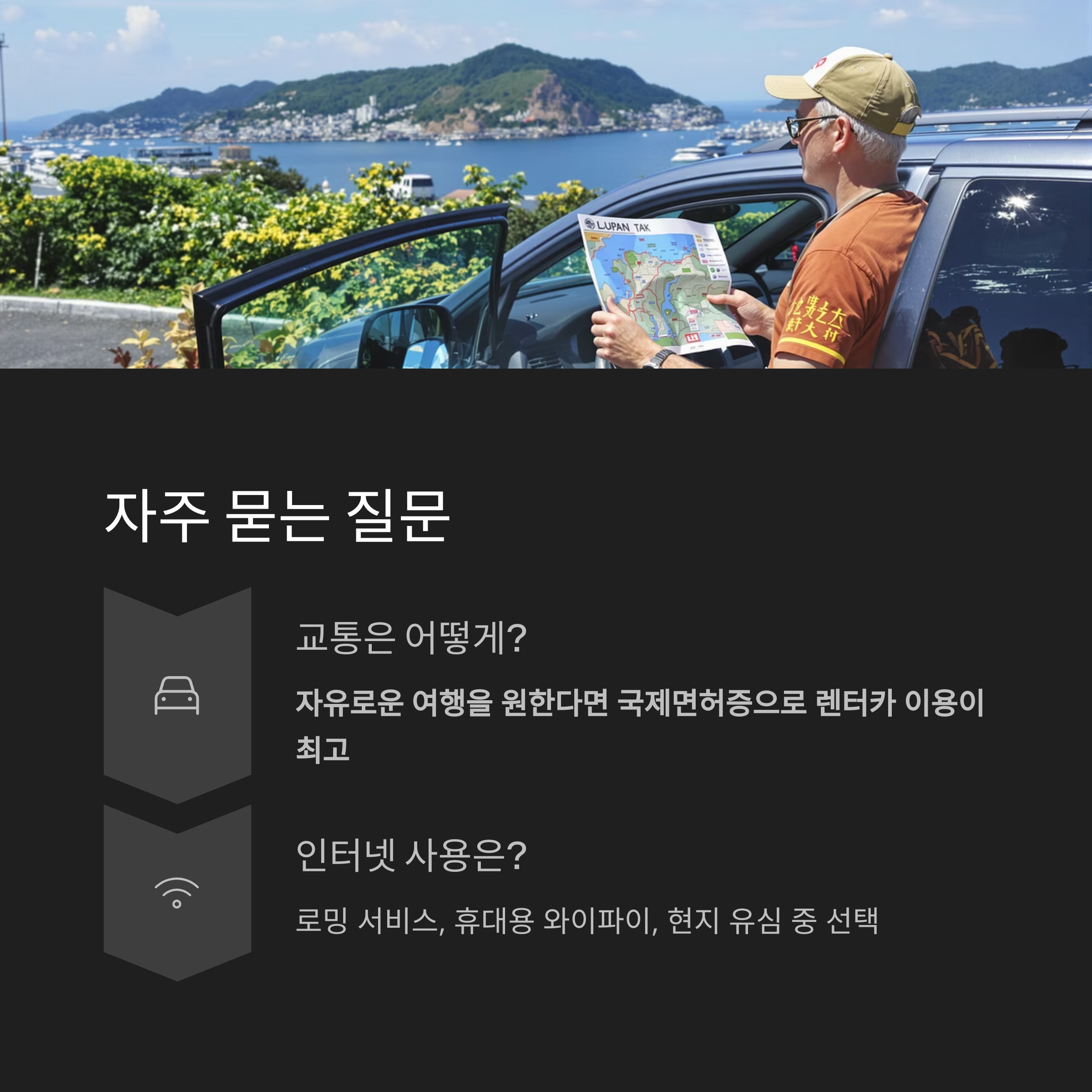 국제면허증이 필요하다면 발급받고, 렌터카를 이용할 계획이라면 미리 예약합니다.