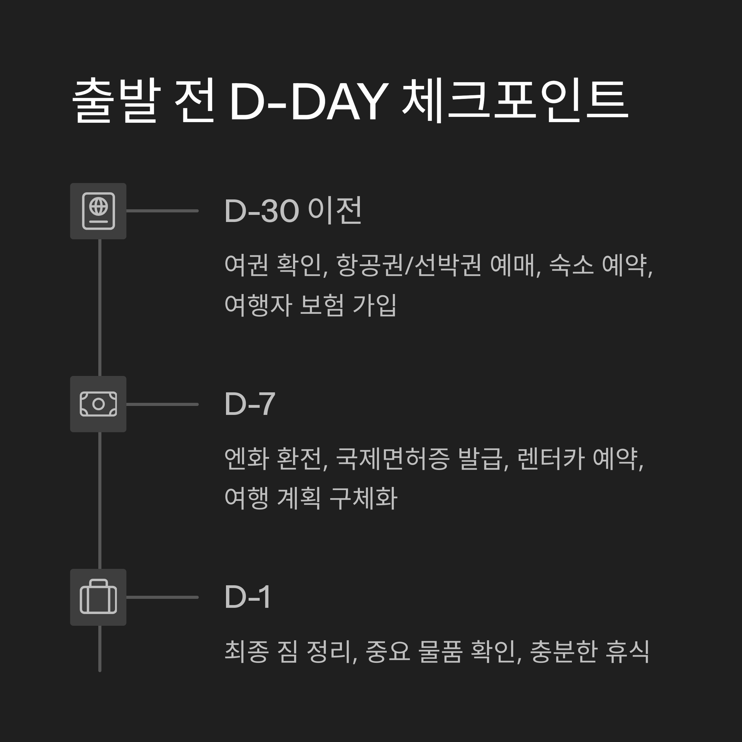꼼꼼히 확인하여 빠짐없이 챙기시길 바랍니다. 이것만 준비해도 여행의 절반은 성공입니다.