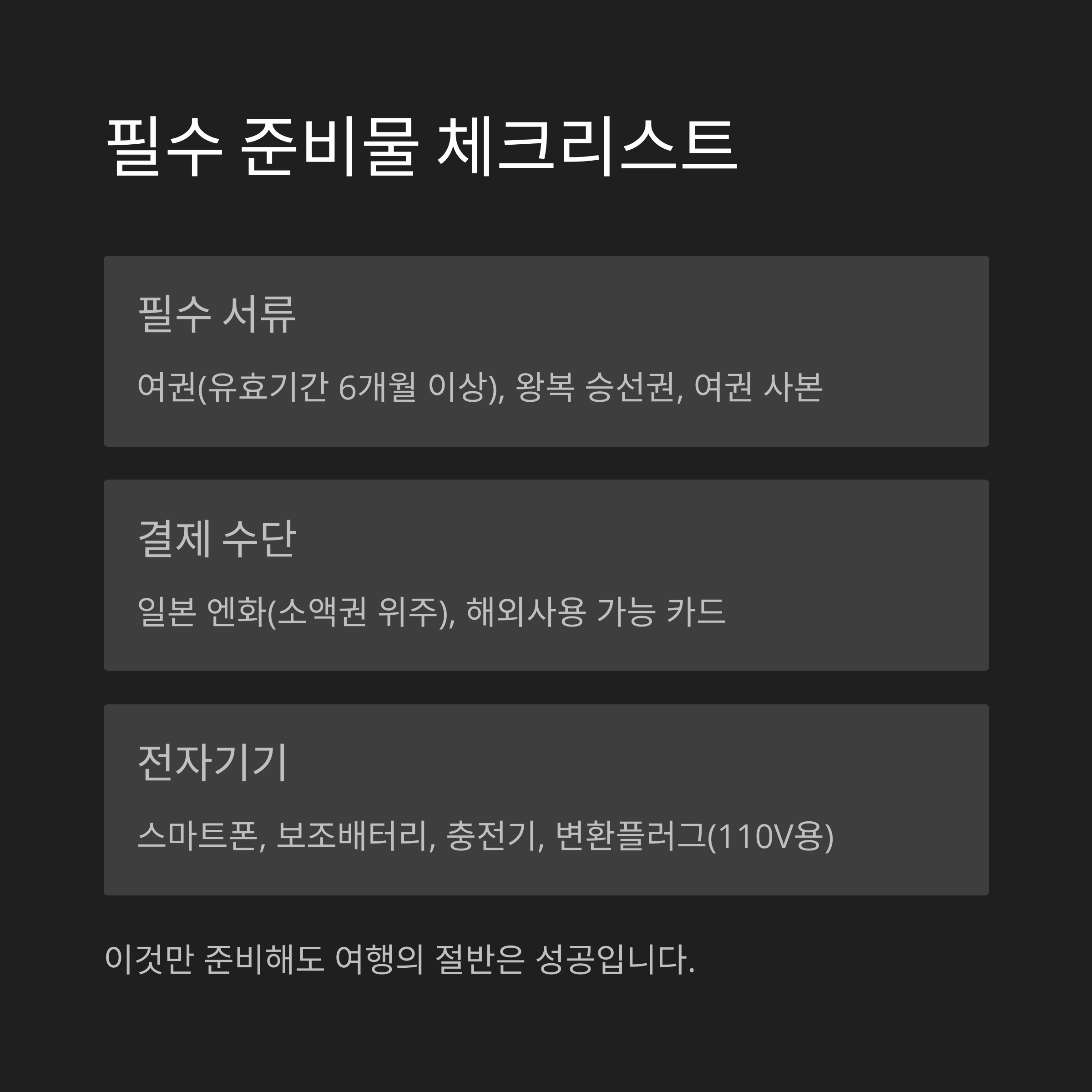 | 현금/카드 | 일본 엔화, 해외 사용 가능 신용/체크카드 | 소액권 위주 환전, 카드 비상시 대비 |