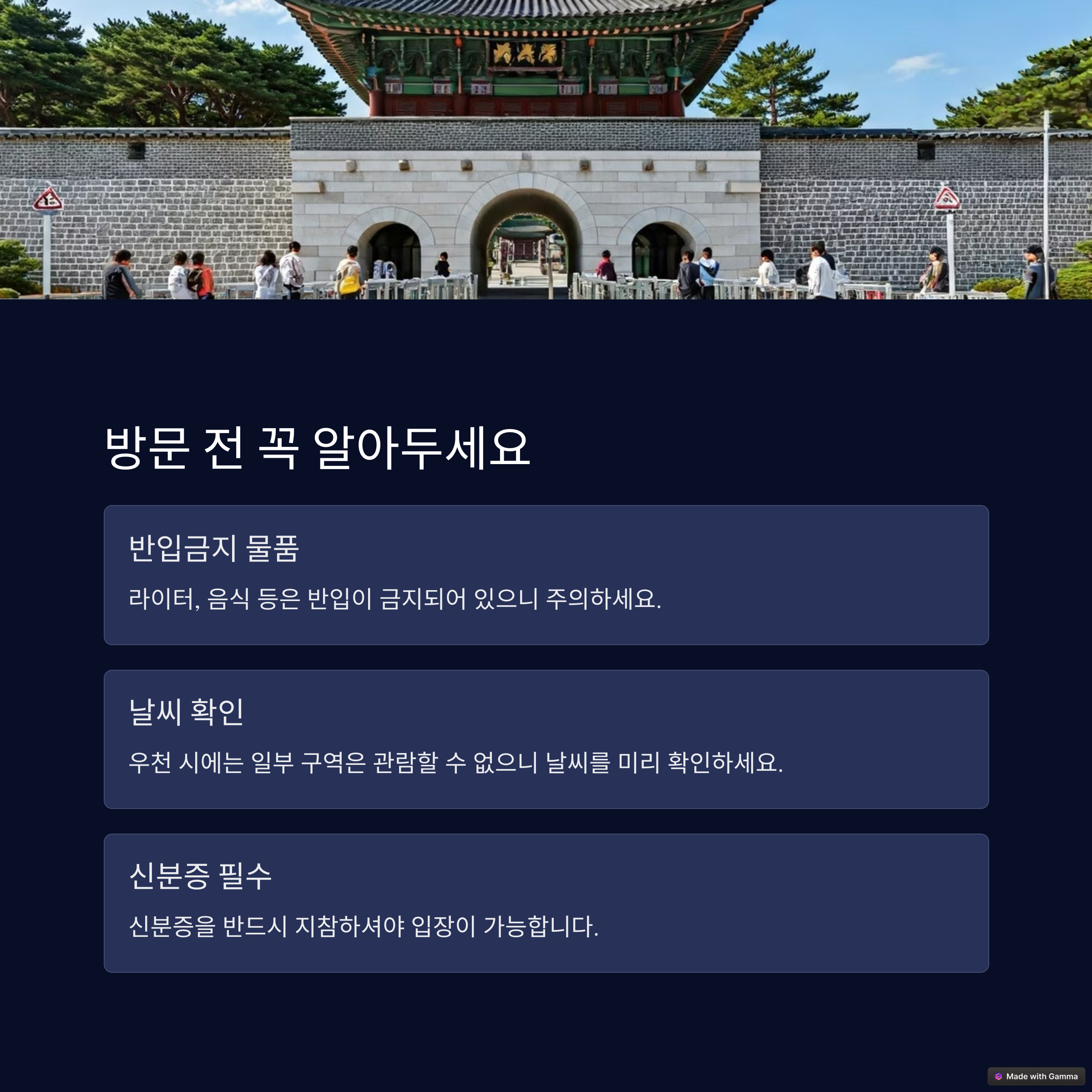 | 청와대 본관 | 대통령 집무실, 역사적 공간 | 사전 예약 필수, 보안 검색 진행 |