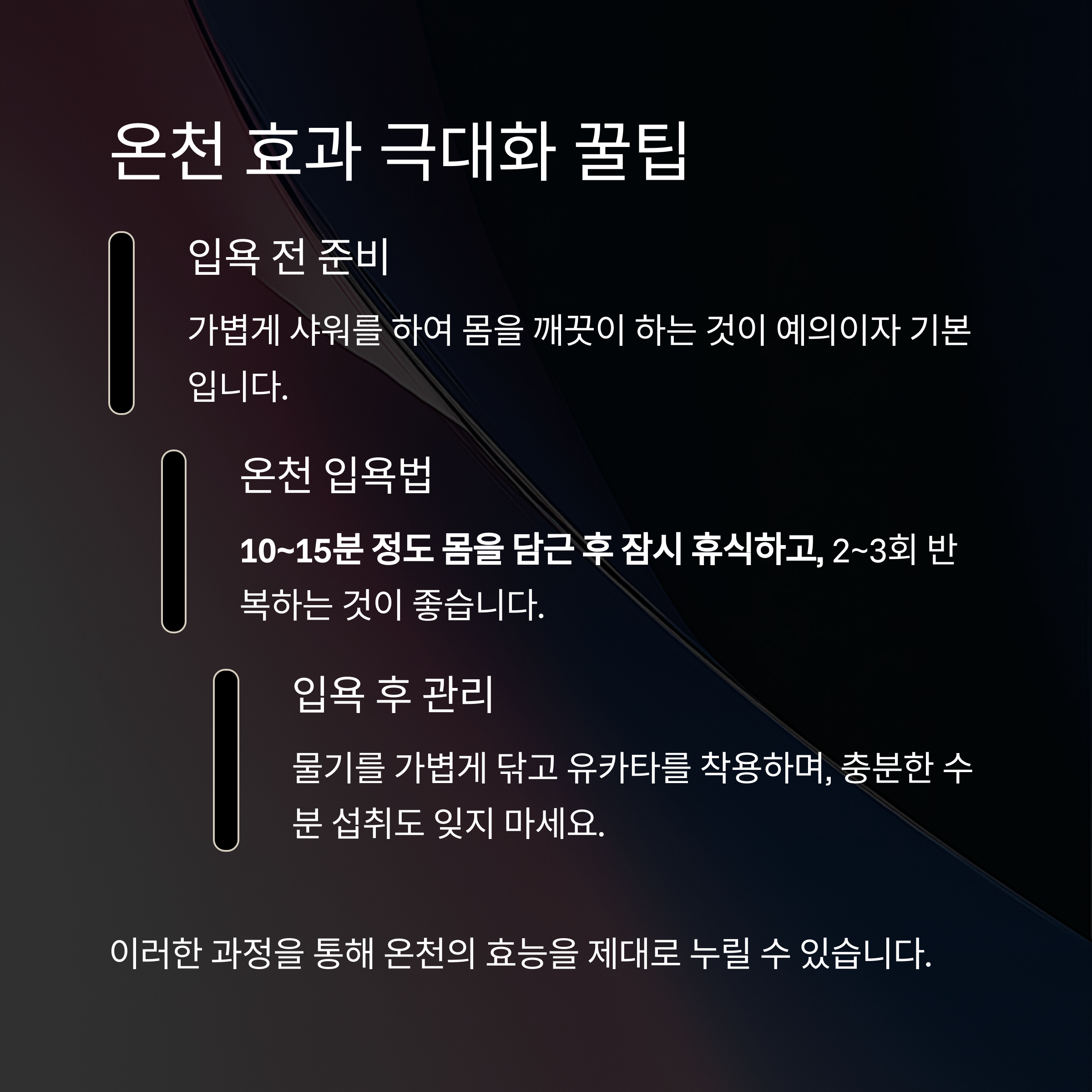 이러한 과정을 통해 온천의 효능을 제대로 누릴 수 있습니다.