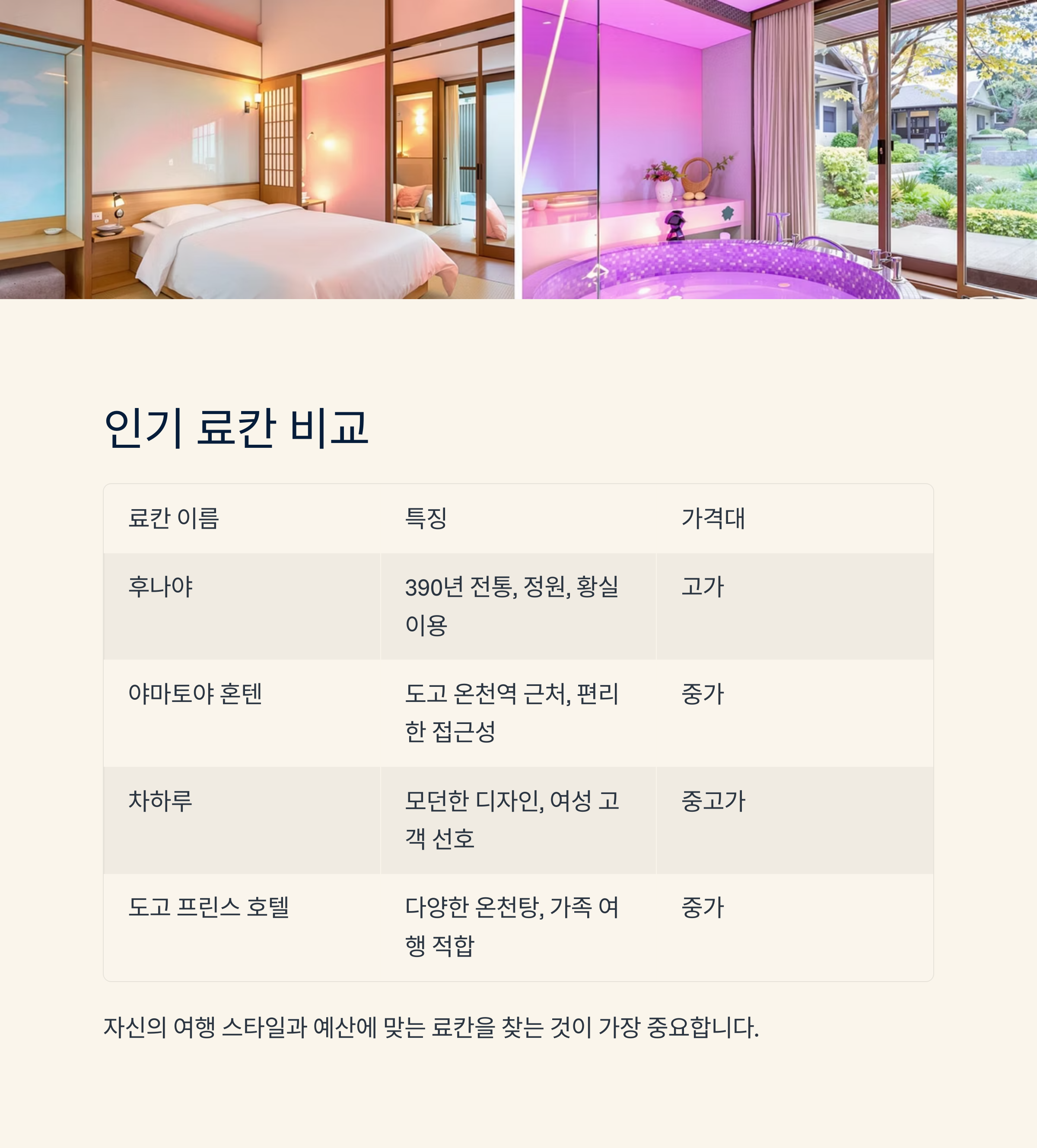 선택에 도움을 드리고자 몇몇 인기 료칸의 특징을 간략히 비교해 보았습니다.