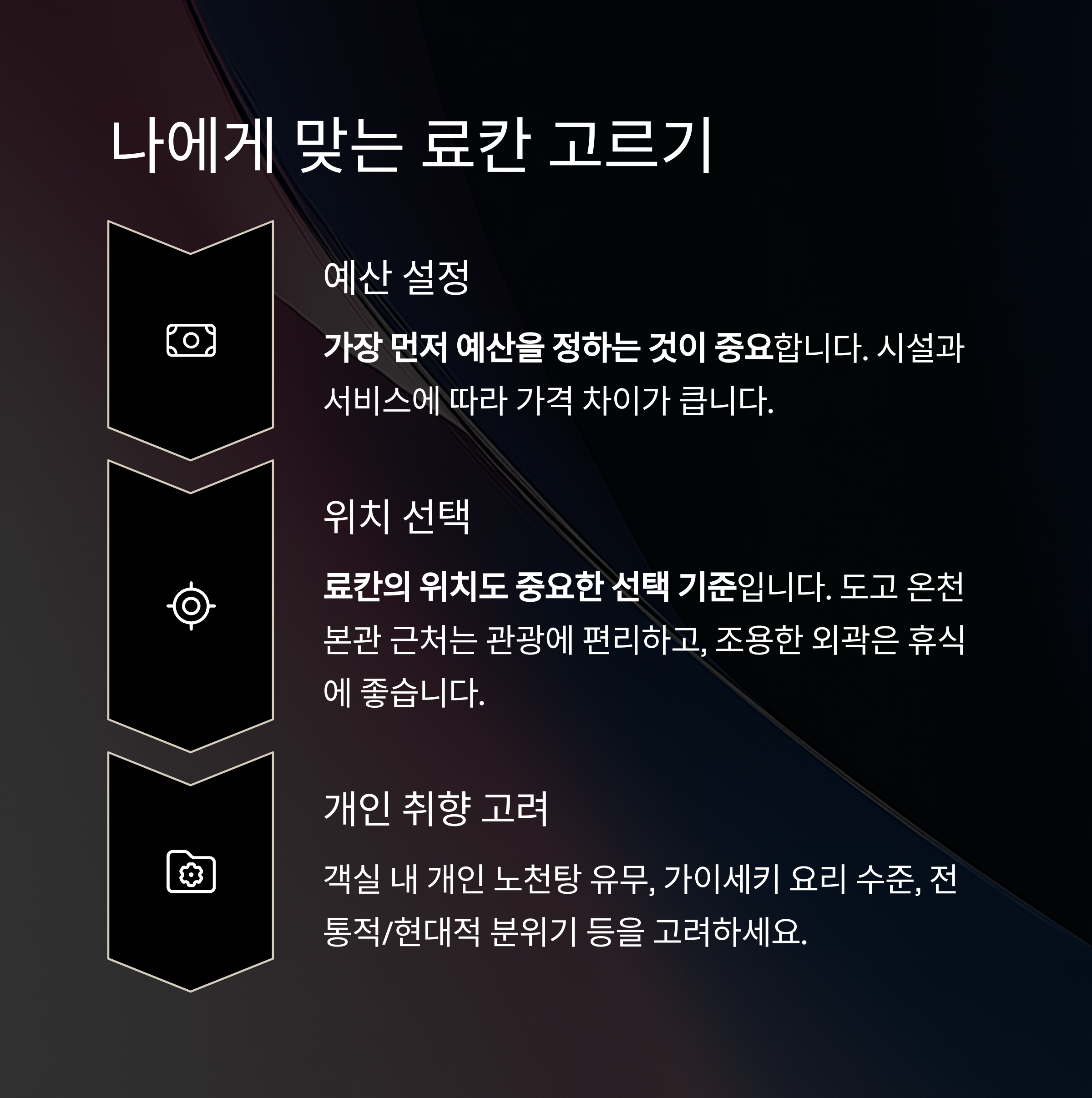 전통적인 분위기 혹은 현대적인 시설 등 개인의 취향을 고려하는 것이 핵심입니다.