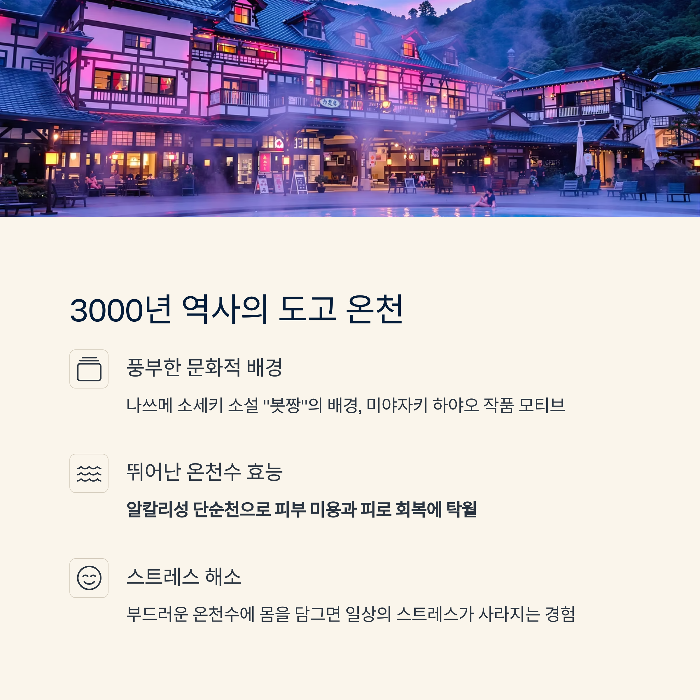 약 3000년의 역사를 자랑하는 이 온천은 나쓰메 소세키의 소설 "봇짱"의 배경이 되기도 했으며,