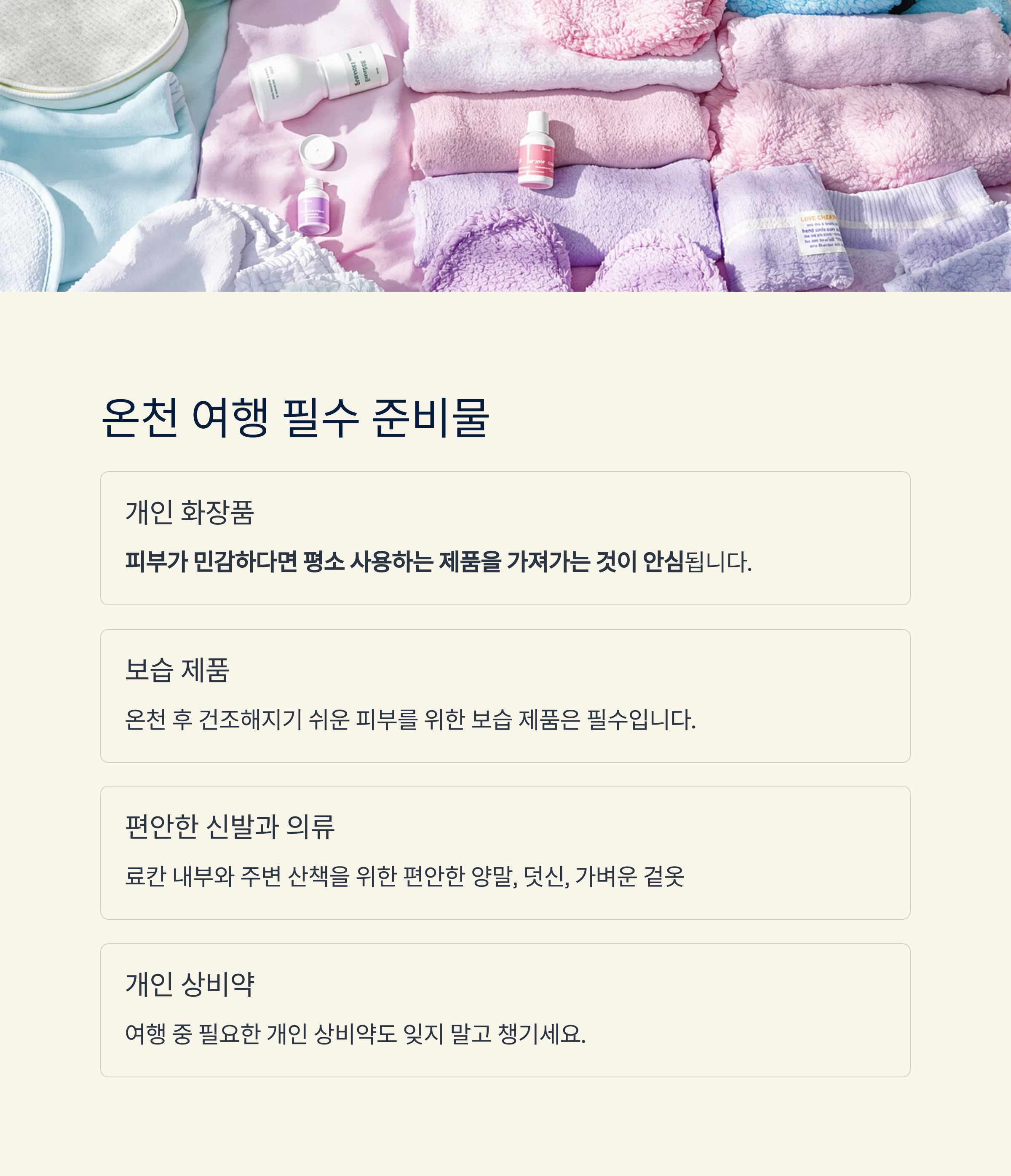 온천 후 건조해지기 쉬운 피부를 위해 보습 제품도 필수입니다.