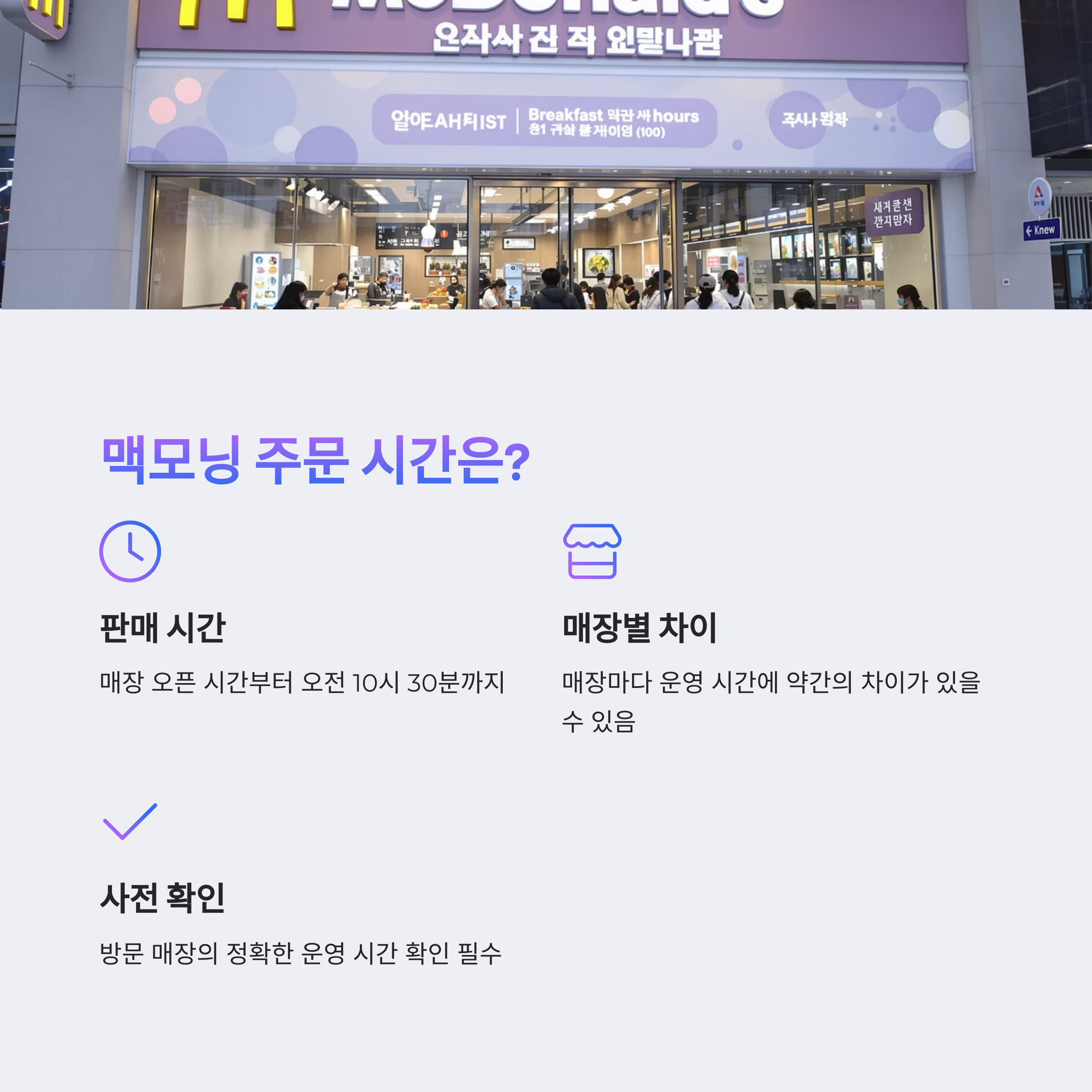 24시간 운영 매장의 경우에도 맥모닝 판매 시간은 정해져 있으니 유의해야 합니다.
