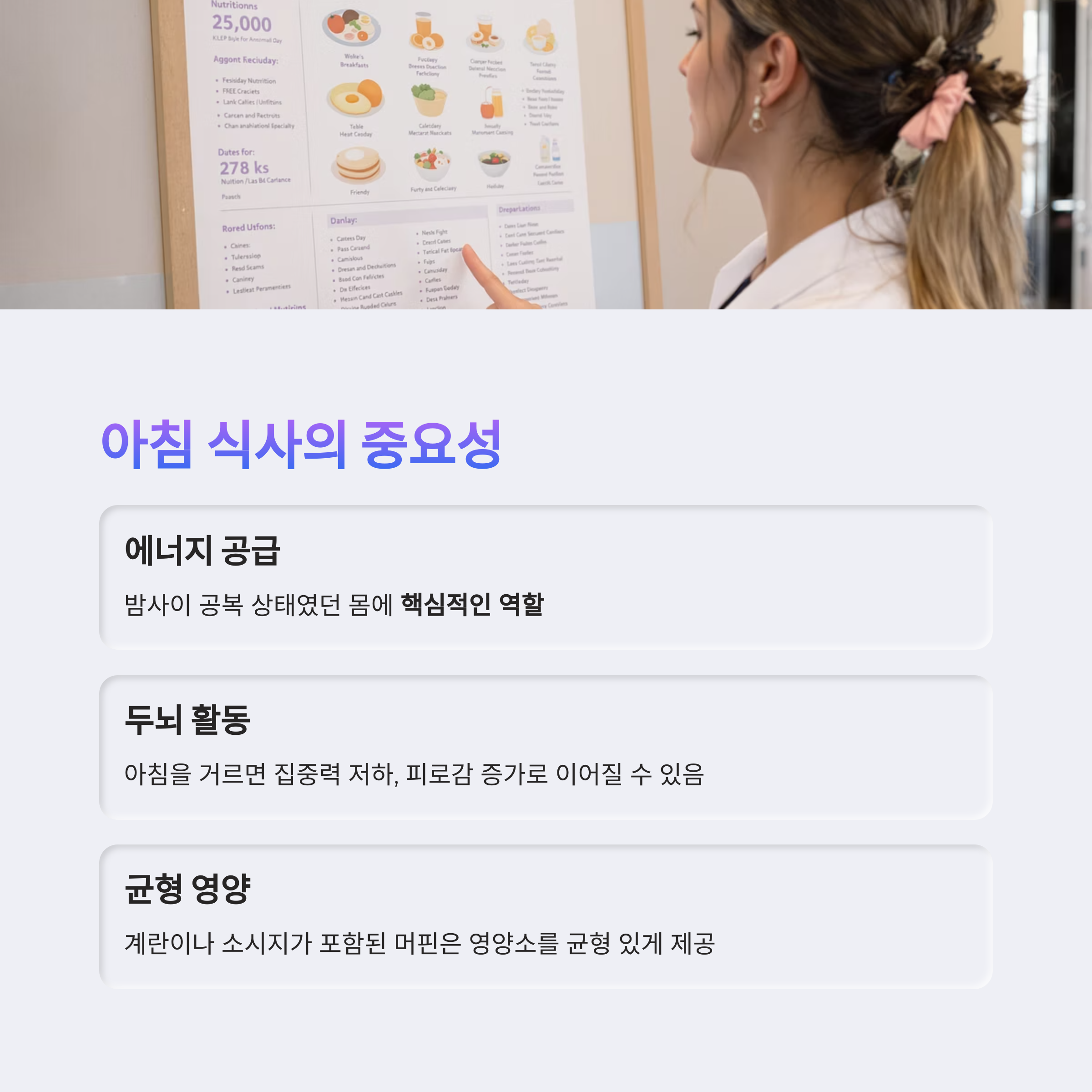""아침 식사는 밤사이 공복 상태였던 우리 몸에 에너지를 공급하고, 두뇌 활동을 활발하게 하는 핵심적인 역할을 합니다.