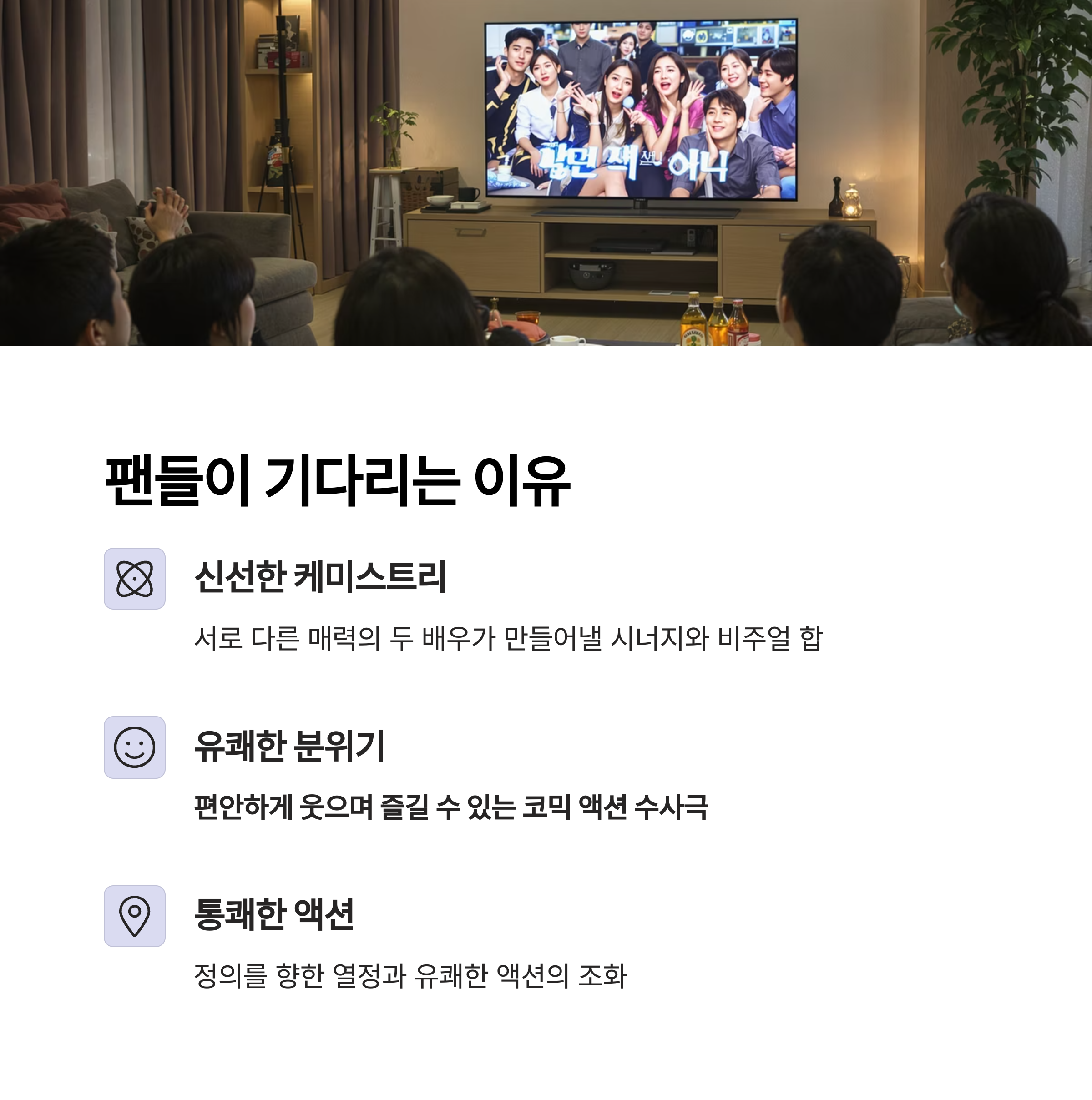 | 장르적 재미 | 코믹, 액션, 수사가 결합된 복합 장르의 다채로운 재미 | 폭넓은 시청자층 공략 가능 |