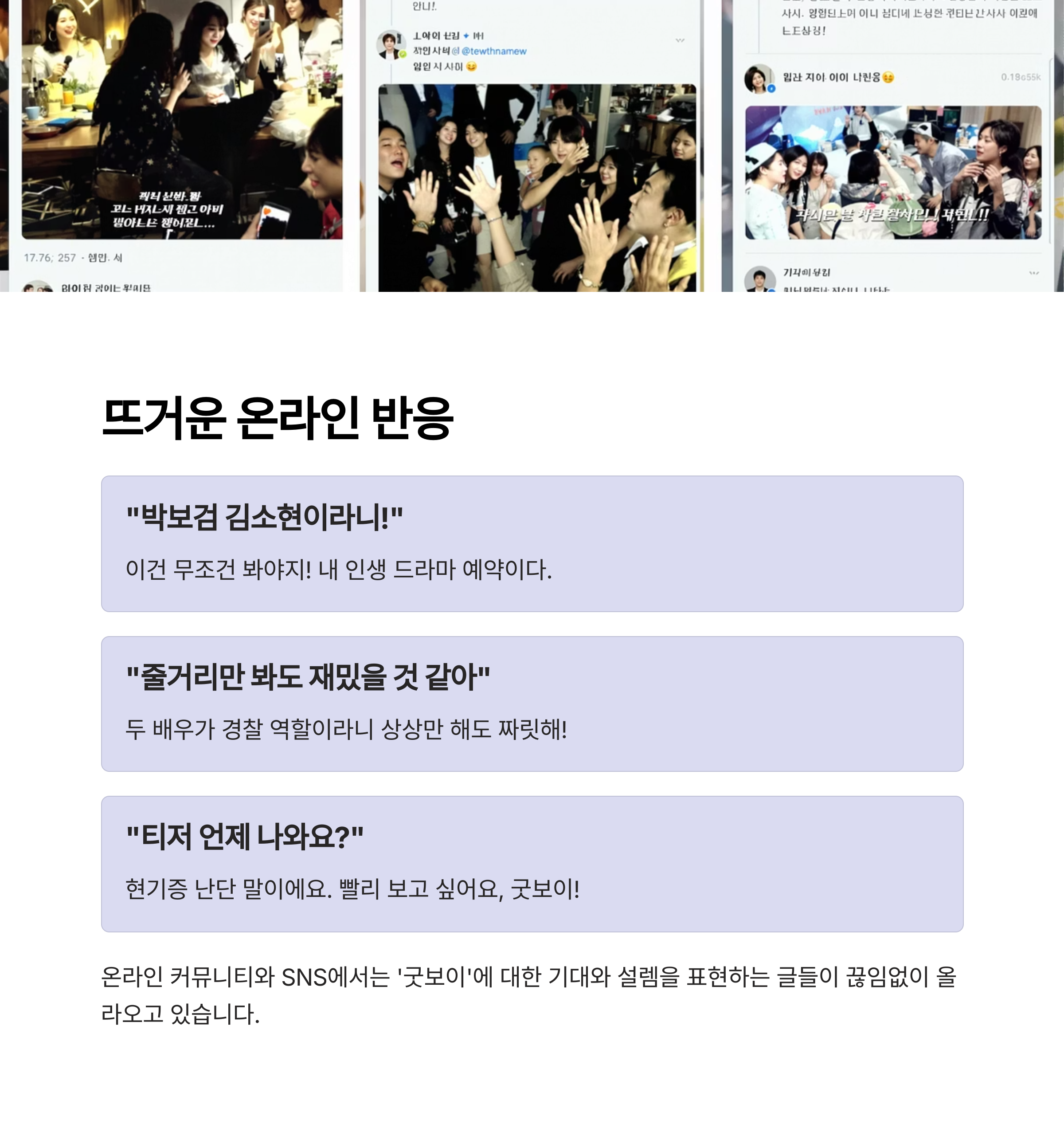 이처럼 온라인 커뮤니티와 SNS에서는 '굿보이'에 대한 기대와 설렘을 표현하는 글들이 끊임없이 올라오고 있습니다.