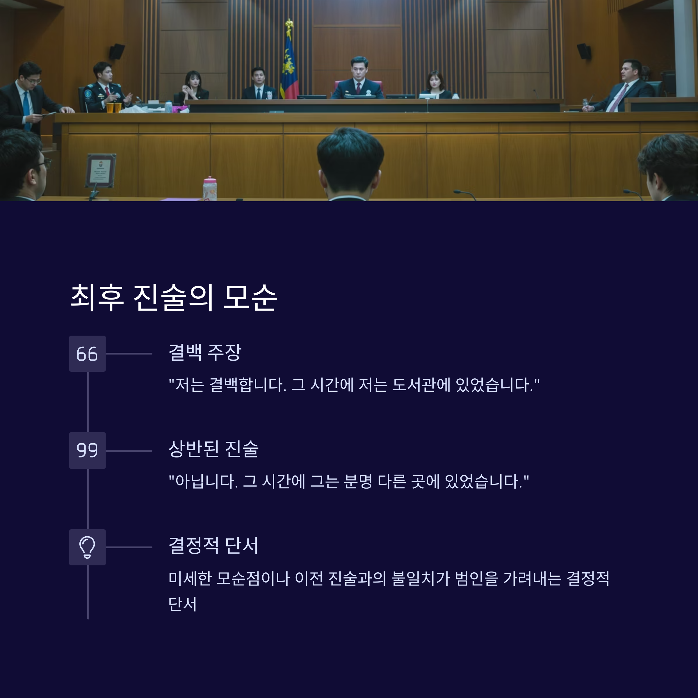 이러한 최후 진술 속에서 나타나는 미세한 모순점이나 이전 진술과의 불일치는 범인을 가려내는 결정적인 단서가 됩니다.