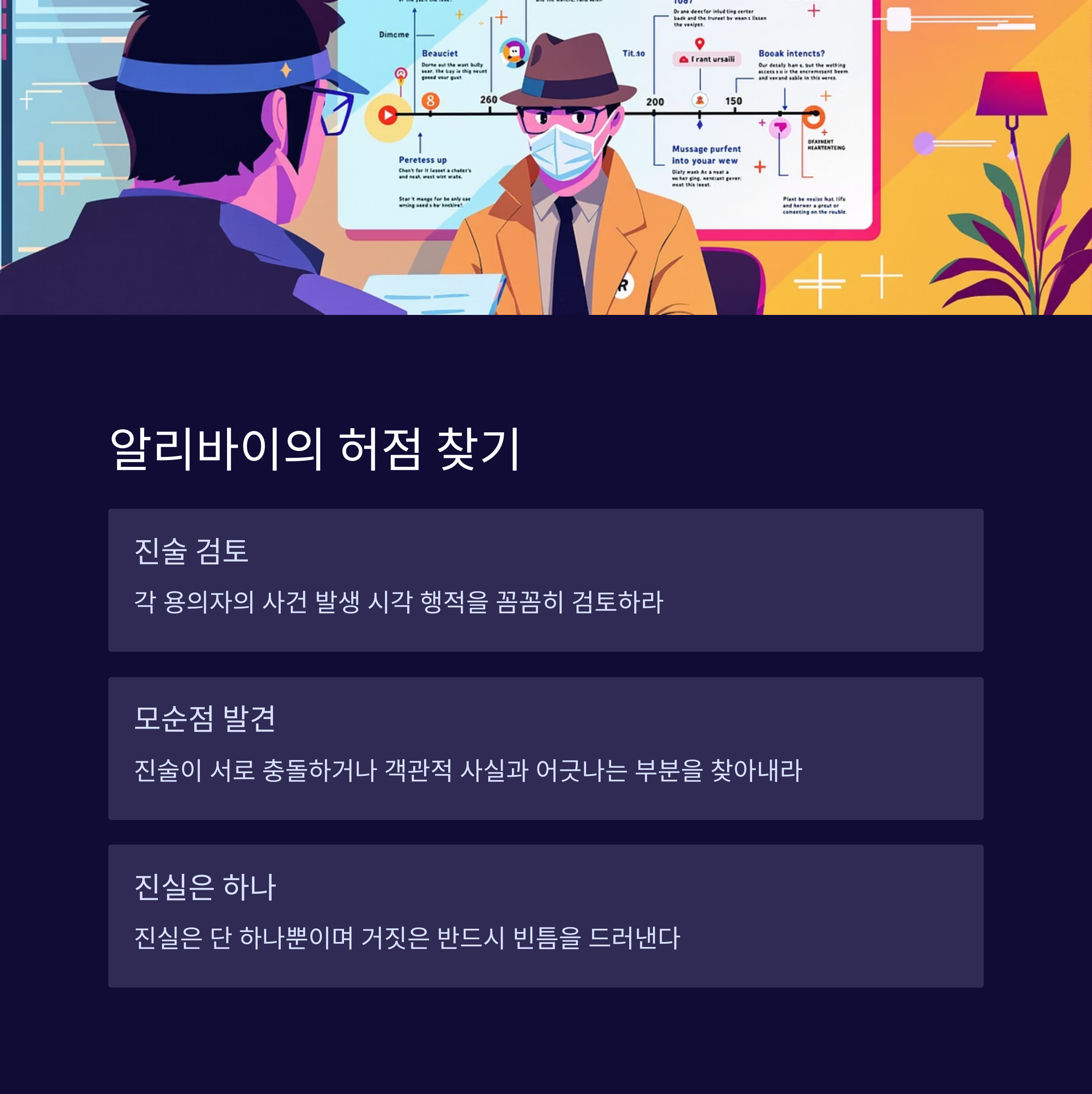 이처럼 알리바이의 모순점을 파고드는 것은 범인의 정체를 밝히는 효과적인 방법입니다.