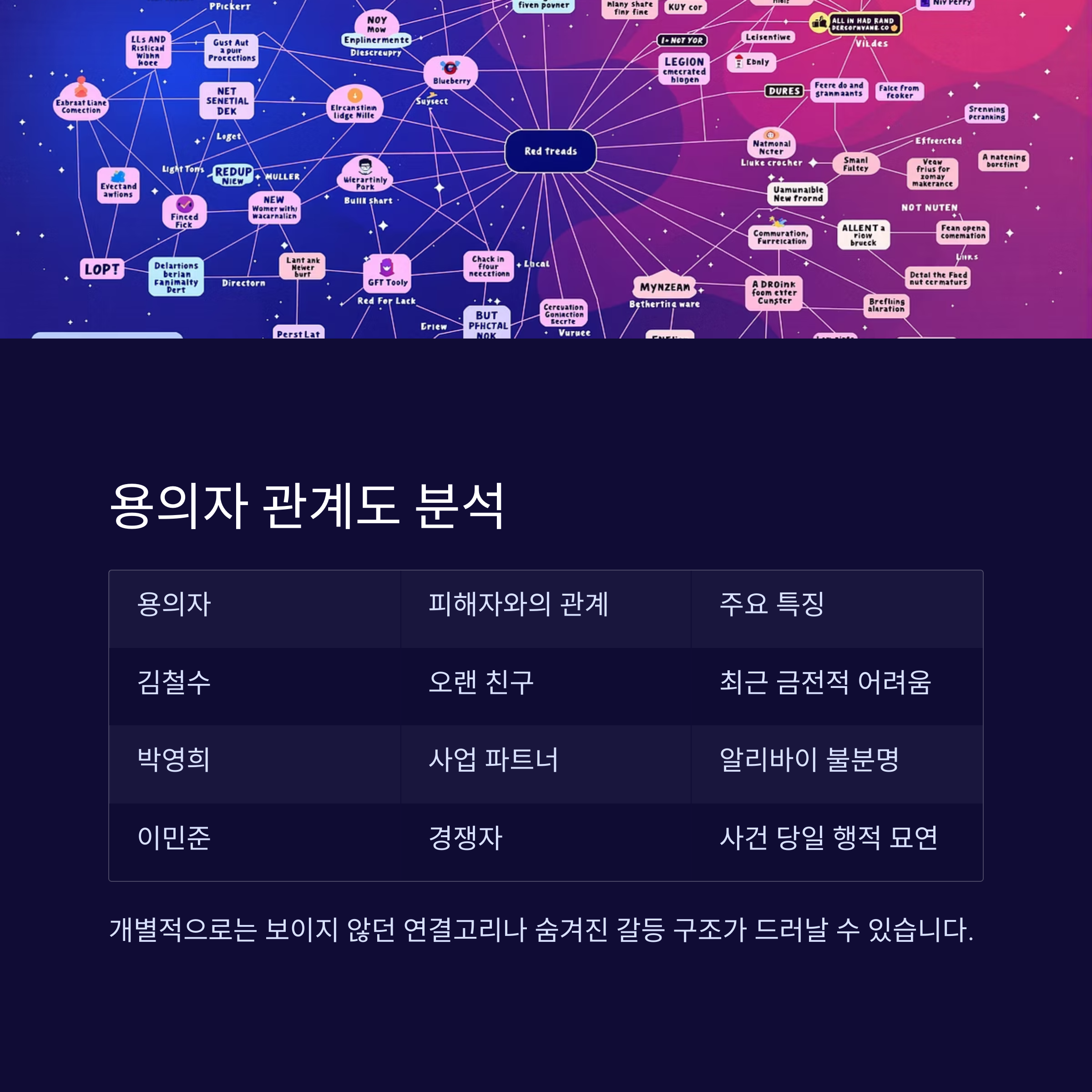 이처럼 용의자들의 관계를 시각적으로 정리하면, 개별적으로는 보이지 않던 연결고리나 숨겨진 갈등 구조가 드러날 수 있습니다.