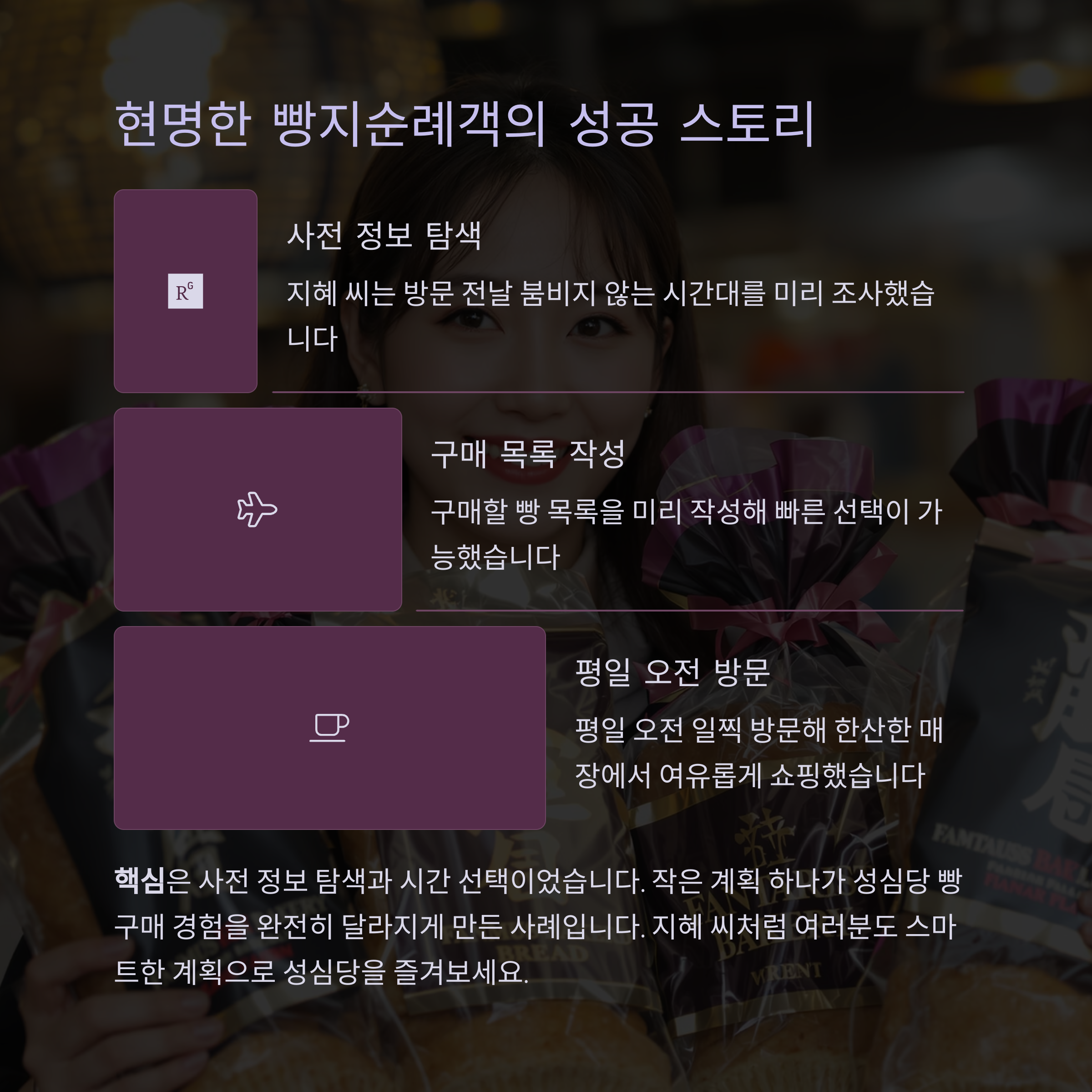 지혜 씨는 오늘 대전으로 빵지순례를 떠났습니다. 그녀의 목표는 성심당에서 오랫동안 맛보고 싶었던 빵들을 구매하는 것이었습니다. 지혜 씨는 방문 전날, 사람들이 덜 붐비는 시간대를 미리 알아보았습니다. 그리고 평일 오전 일찍 성심당에 도착했습니다. 예상대로 매장 안은 비교적 한산했고, 그녀는 여유롭게 빵을 고를 수 있었습니다. 핵심은 사전 정보 탐색과 시간 선택이었습니다. 그녀는 미리 작성해 온 목록 덕분에 신속하게 빵을 선택하고 계산까지 마칠 수 있었습니다. 덕분에 지혜 씨는 기다림 없이 맛있는 빵을 한아름 안고 만족스러운 발걸음을 옮길 수 있었습니다. 이처럼 작은 계획이 큰 차이를 만들 수 있습니다.