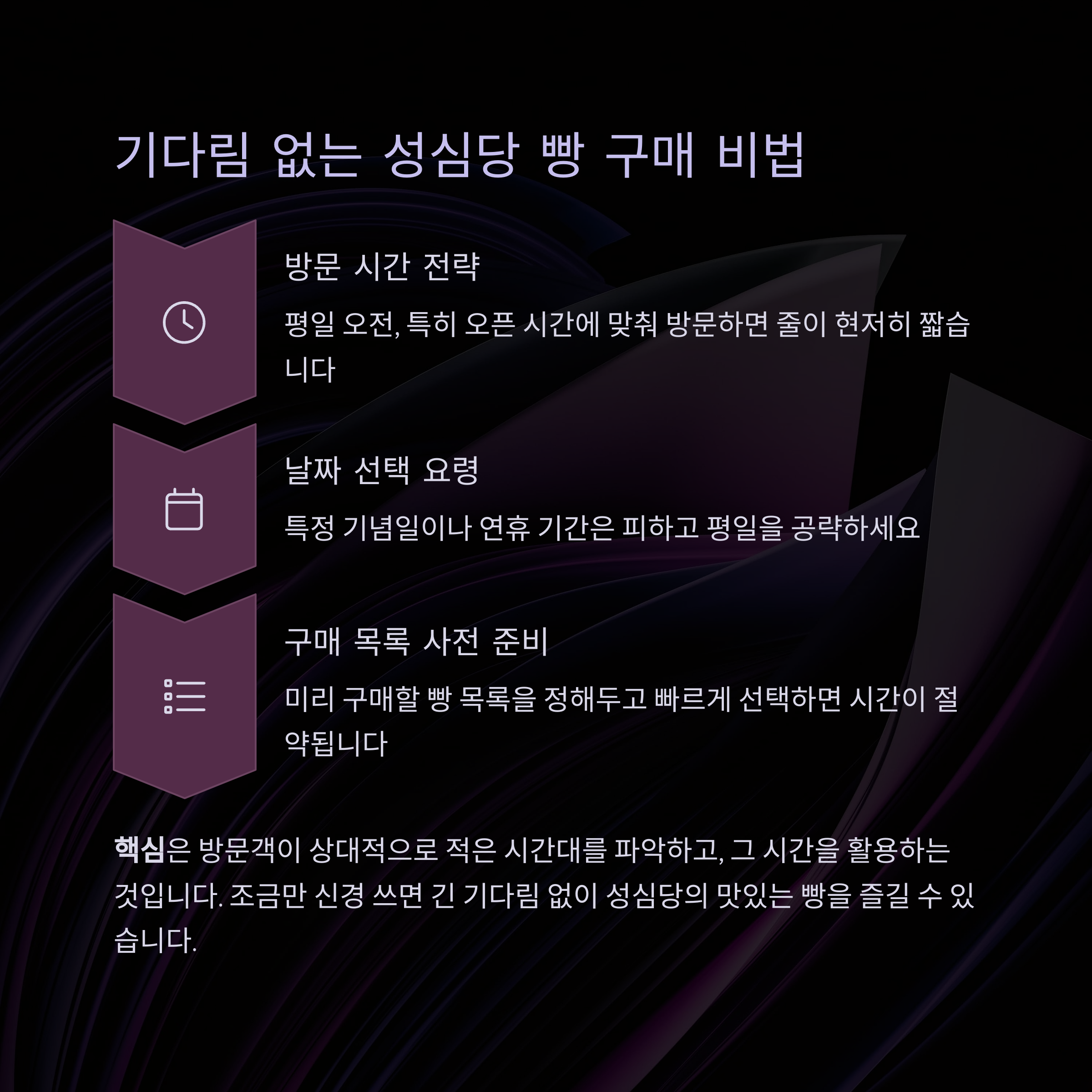 성심당의 인기는 식을 줄 모르지만, 긴 줄은 때로 부담스러울 수 있습니다. 하지만 몇 가지 요령을 알면 이 기다림을 최소화할 수 있습니다. 예를 들어, 많은 사람들이 몰리는 주말 점심시간 이후보다는 평일 오전 시간을 공략하는 것이 하나의 방법이 될 수 있습니다. 또한, 특정 기념일이나 연휴 기간을 피하는 것도 좋은 선택입니다. 핵심은 방문객이 상대적으로 적은 시간대를 파악하고, 그 시간을 활용하는 것입니다. 미리 구매할 빵 목록을 정해두고 빠르게 선택하는 것도 시간을 절약하는 데 도움이 됩니다.