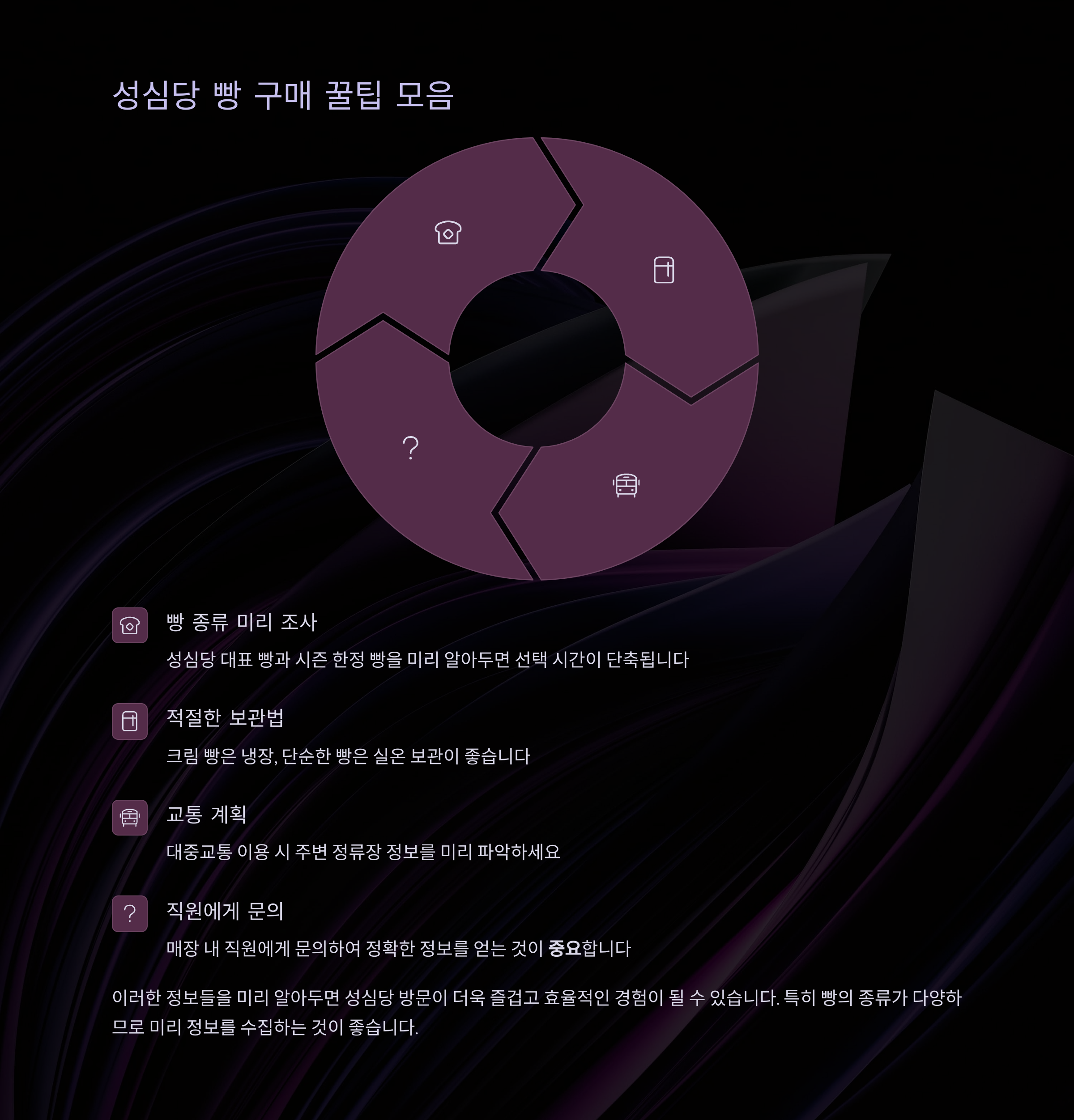 성심당에서 빵을 구매할 때 몇 가지 알아두면 좋은 정보들이 있습니다. 첫째, 빵의 종류가 매우 다양하므로 미리 어떤 종류의 빵을 구매할지 생각해두면 선택 시간을 줄일 수 있습니다. 둘째, 구매한 빵은 가급적 당일에 드시는 것이 가장 맛있지만, 보관해야 할 경우에는 빵의 종류에 따라 적절한 방법으로 보관해야 신선함을 유지할 수 있습니다. 예를 들어, 크림이 들어간 빵은 냉장 보관하는 것이 좋습니다. 중요한 것은 매장 내 안내나 직원에게 문의하여 정확한 정보를 얻는 것입니다. 마지막으로, 대중교통 이용 시 주변 정류장 정보를 미리 파악해두면 편리합니다.