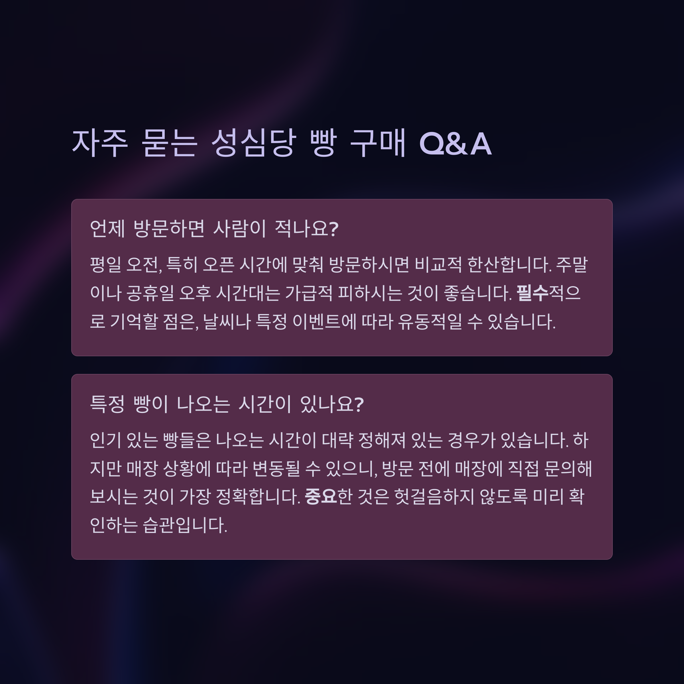 안내자: 네, 좋은 질문입니다. 일반적으로 평일 오전, 특히 오픈 시간에 맞춰 방문하시면 비교적 한산하게 빵을 고르실 수 있습니다. 주말이나 공휴일 오후 시간대는 가급적 피하시는 것이 좋습니다. 필수적으로 기억하셔야 할 점은, 날씨나 특정 이벤트에 따라 유동적일 수 있으니 참고만 하시는 것이 좋겠습니다.