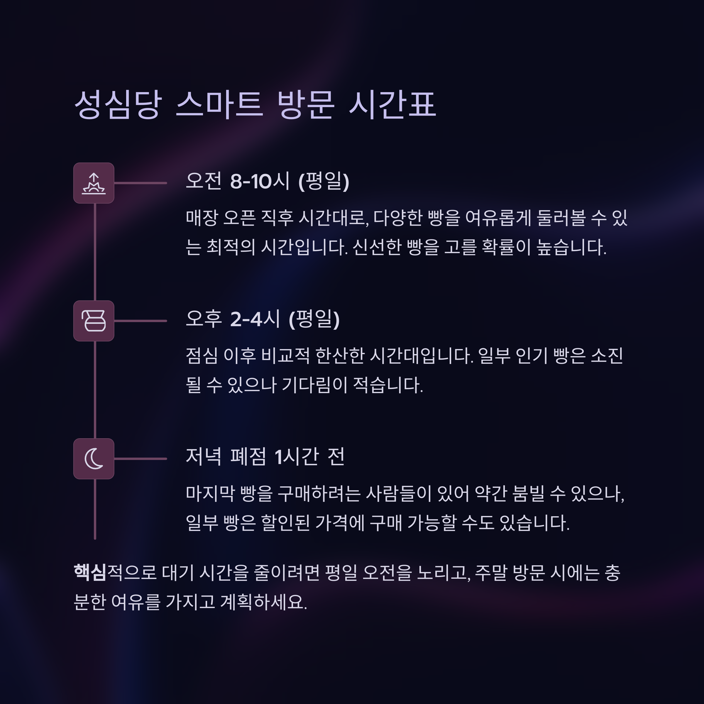 방문객: 성심당 빵을 사러 가려고 하는데, 언제가 가장 사람이 적을까요? 줄 서는 것을 정말 피하고 싶거든요.