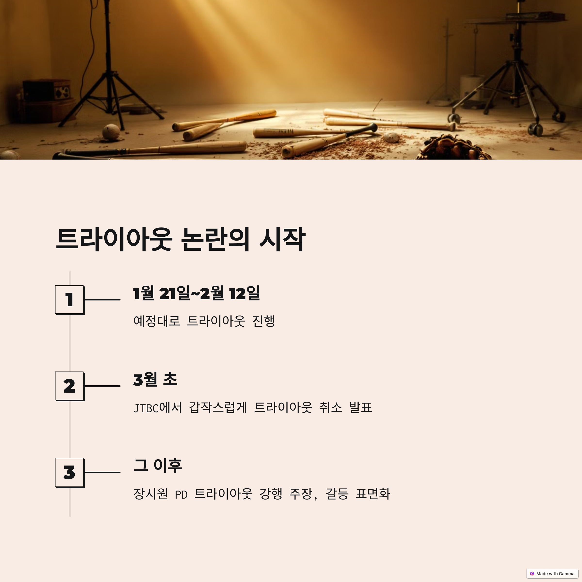 | 트라이아웃 논란 | 예정된 일정 취소 후 강행 논란 | JTBC와 제작진 갈등 |