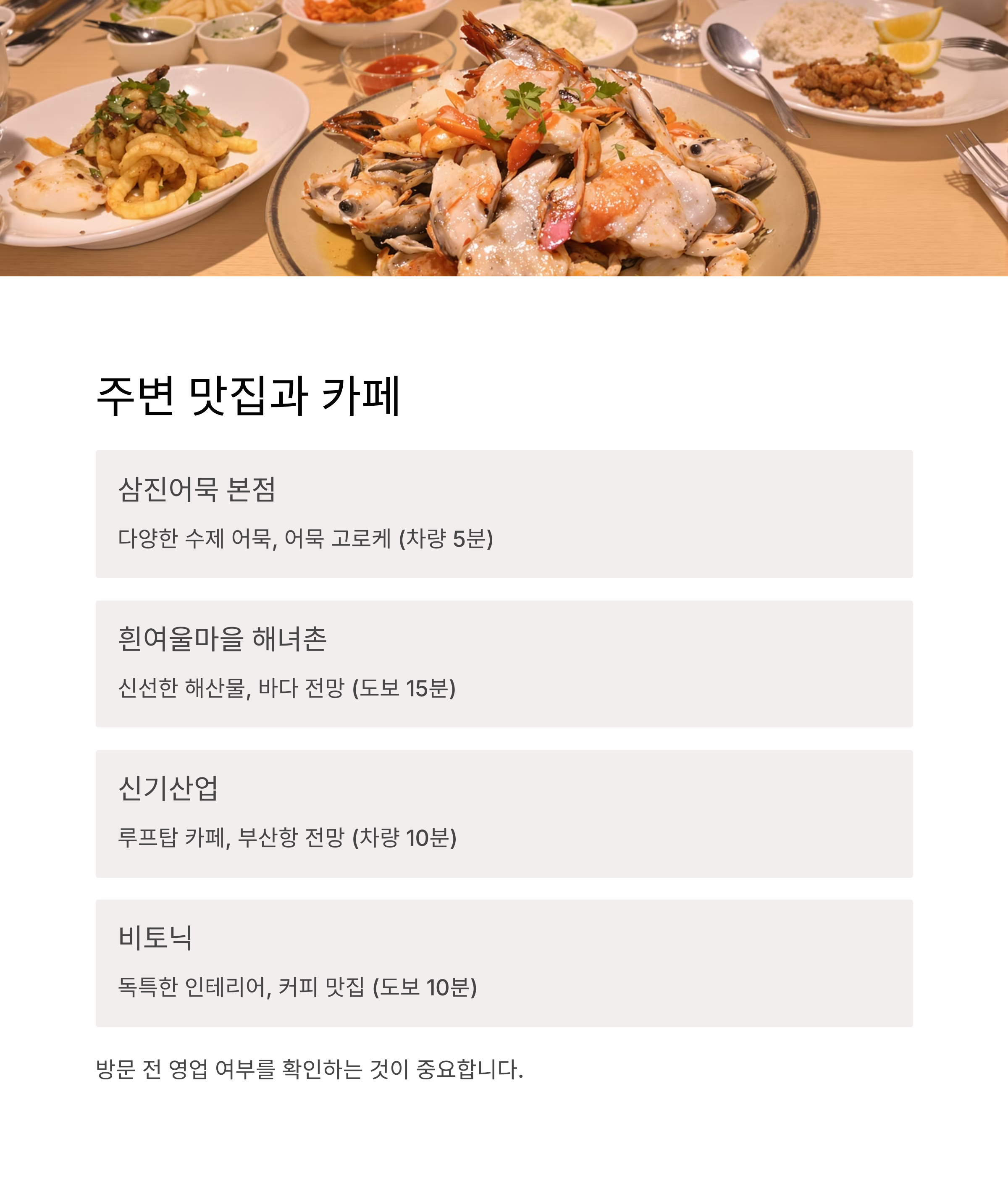 | 맛집 | 흰여울마을 해녀촌 | 신선한 해산물, 바다 전망 | 도보 15분 |