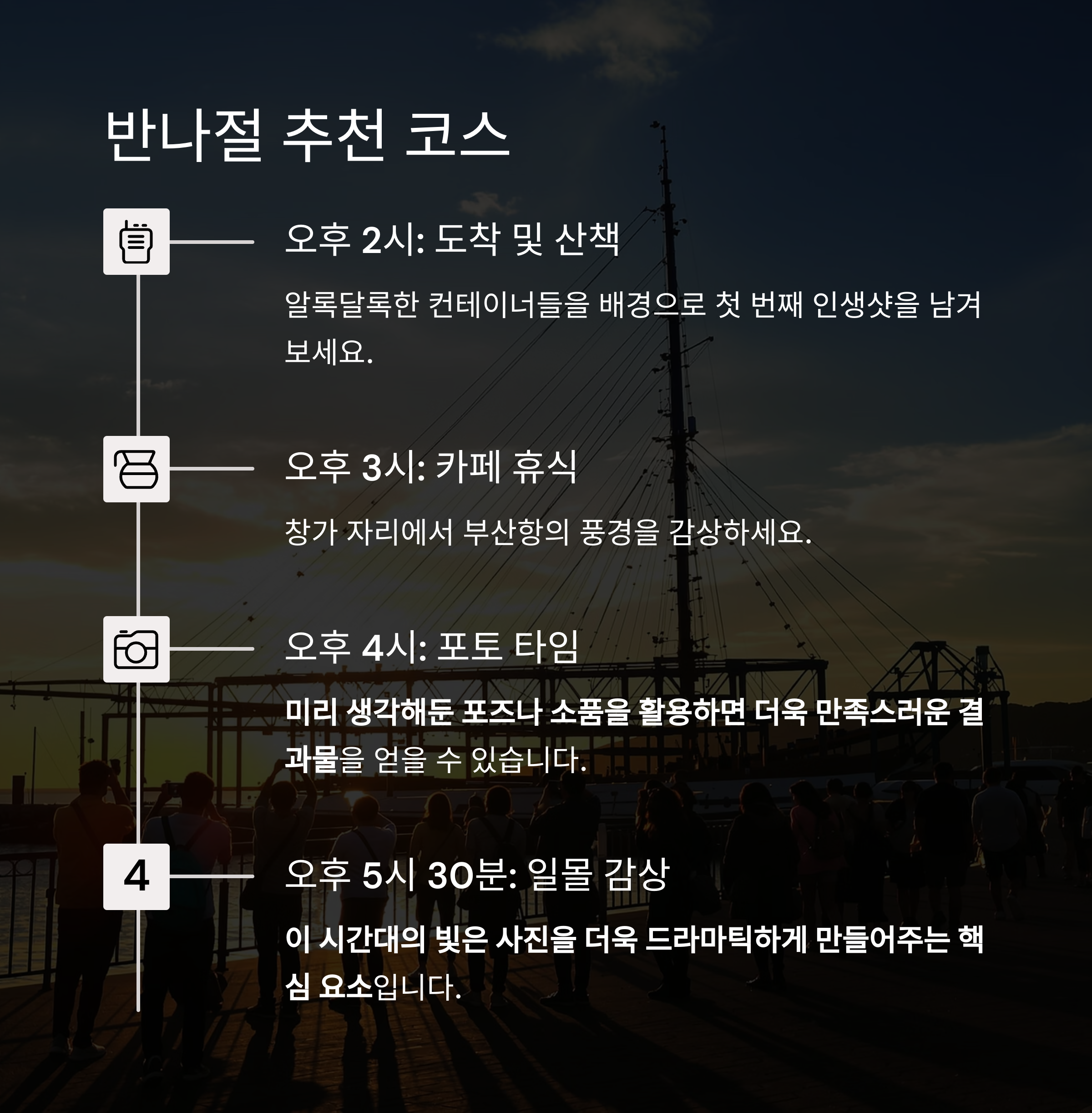 이곳은 단순한 사진 명소를 넘어, 부산의 활기찬 항구 문화를 느낄 수 있는 특별한 장소입니다.