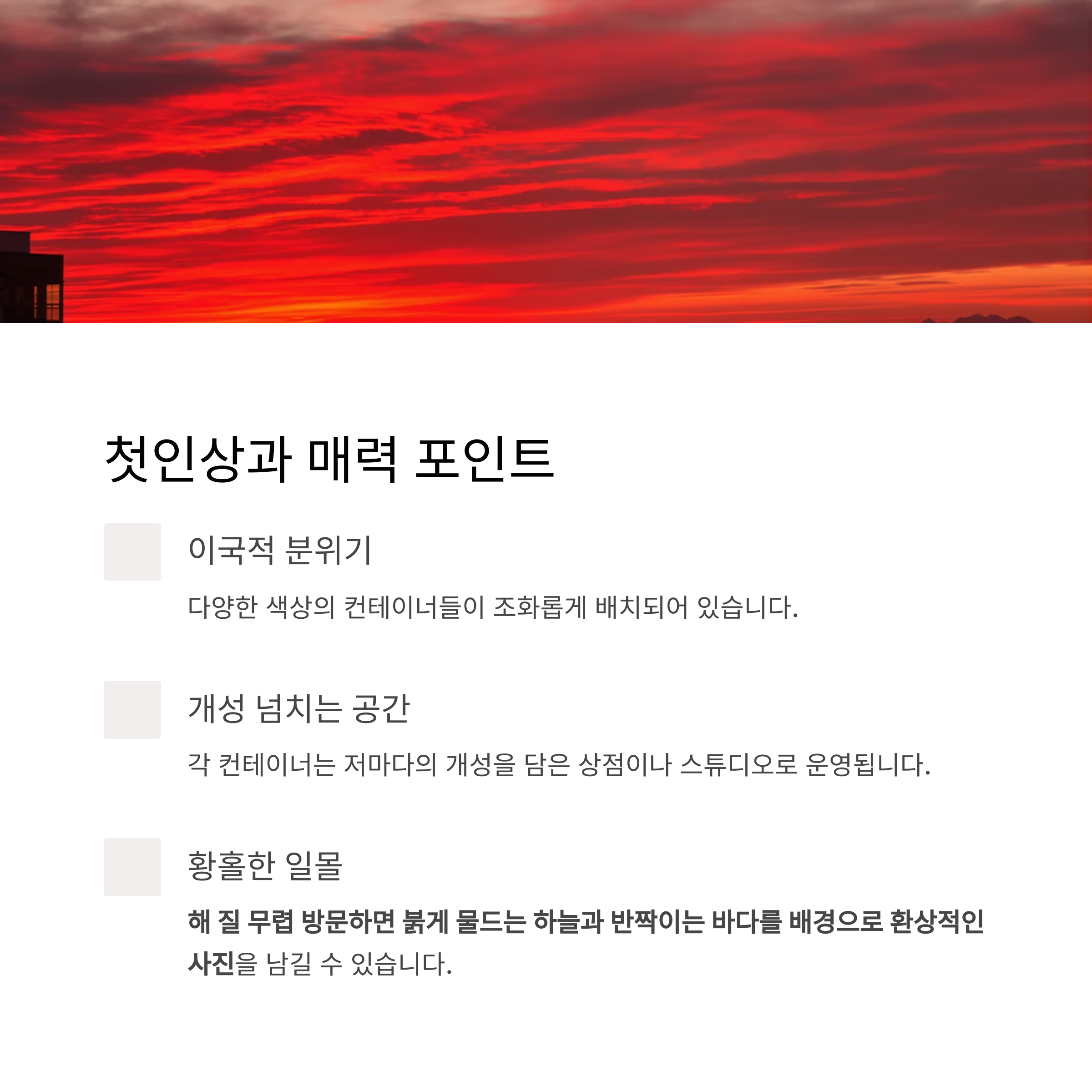 특히 해 질 무렵 방문하면 붉게 물드는 하늘과 반짝이는 바다를 배경으로 환상적인 사진을 남길 수 있다는 점이 핵심 매력입니다.