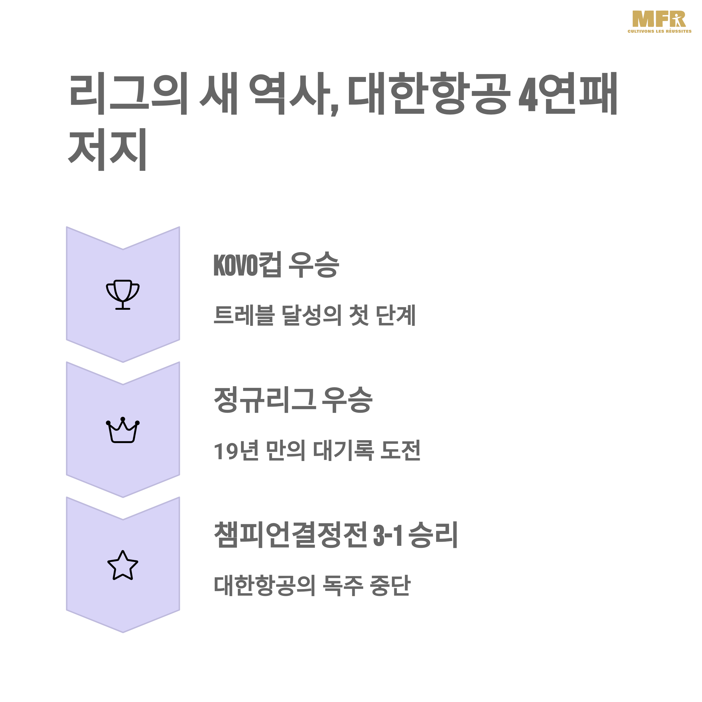 특히 의미가 큰 것은 현대캐피탈이 통합 4연패를 달성했던 대한항공의 독주를 끊고 새로운 강자로 부상했다는 점이에요. 대한항공은 최근 몇 년간 리그를 지배했지만, 이번 시즌에는 현대캐피탈의 부상으로 무관으로 시즌을 마감해야 했답니다.