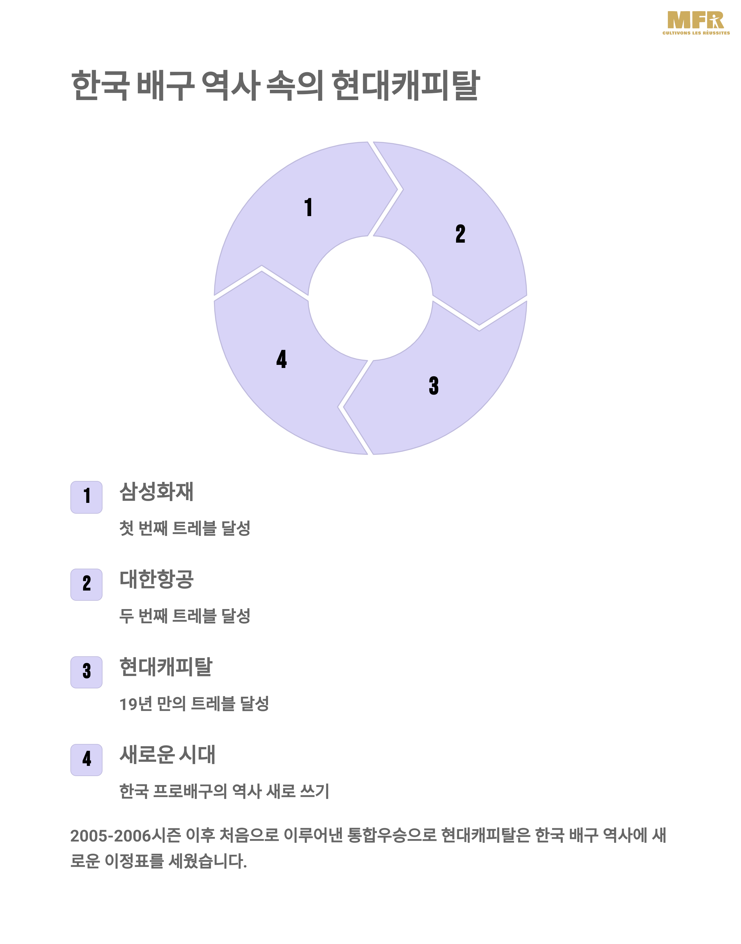 현대캐피탈의 트레블 달성은 한국 프로배구 역사에서 네 번째 사례랍니다. 이전에 트레블을 달성한 팀들을 살펴볼까요?