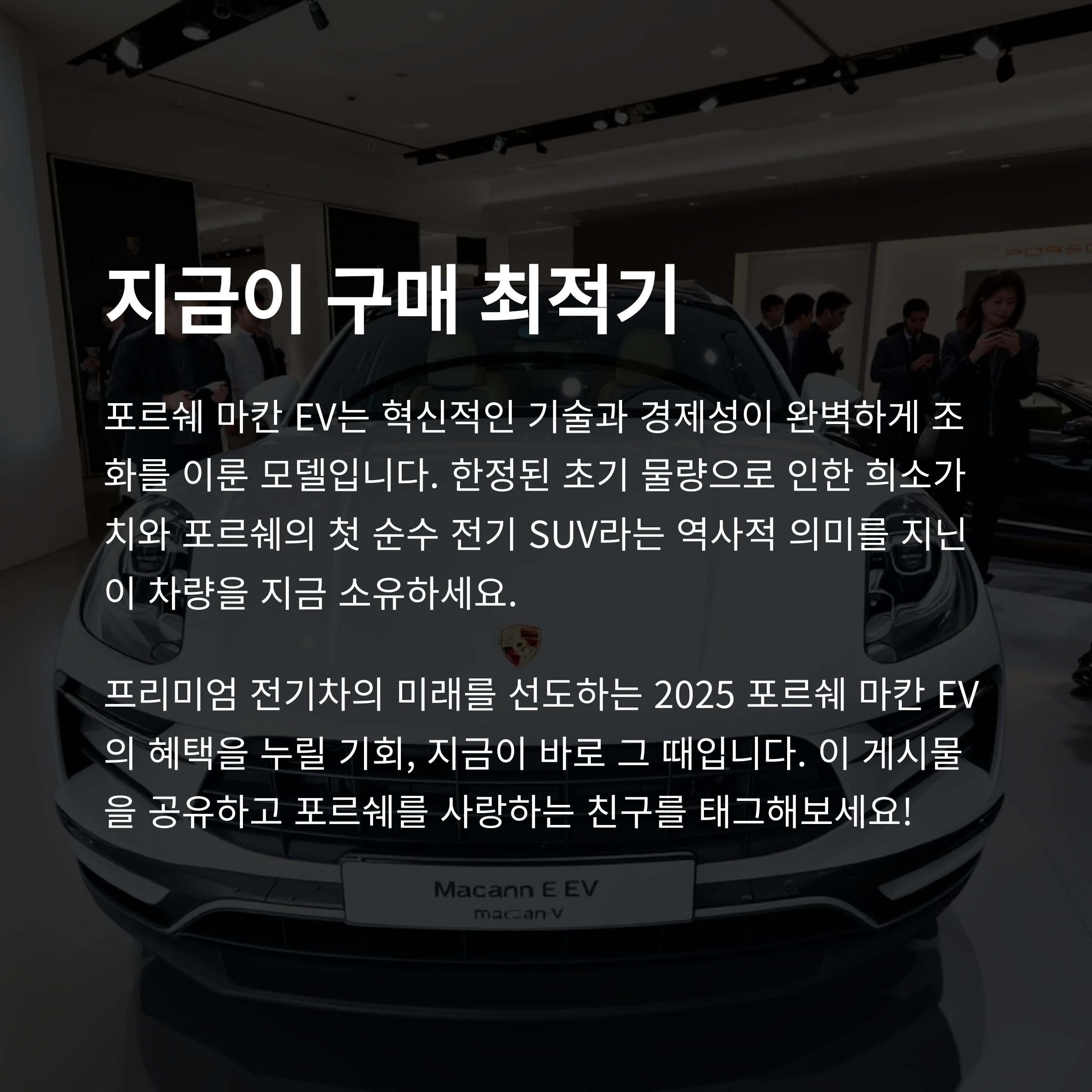 2025 포르쉐 마칸 EV는 단순한 전기차를 넘어, 미래 모빌리티의 방향성과 럭셔리의 본질을 동시에 제시하는 모델입니다. 성능, 디자인, 편의 기능, 그리고 실질적인 혜택까지 두루 갖춘 이 차량은 전기차 전환을 고려하는 모든 소비자에게 이상적인 선택입니다. 한정된 리스 및 구매 조건, 1년간 무료 충전 혜택, 세금 공제 등 지금만 누릴 수 있는 기회를 놓치지 마세요.