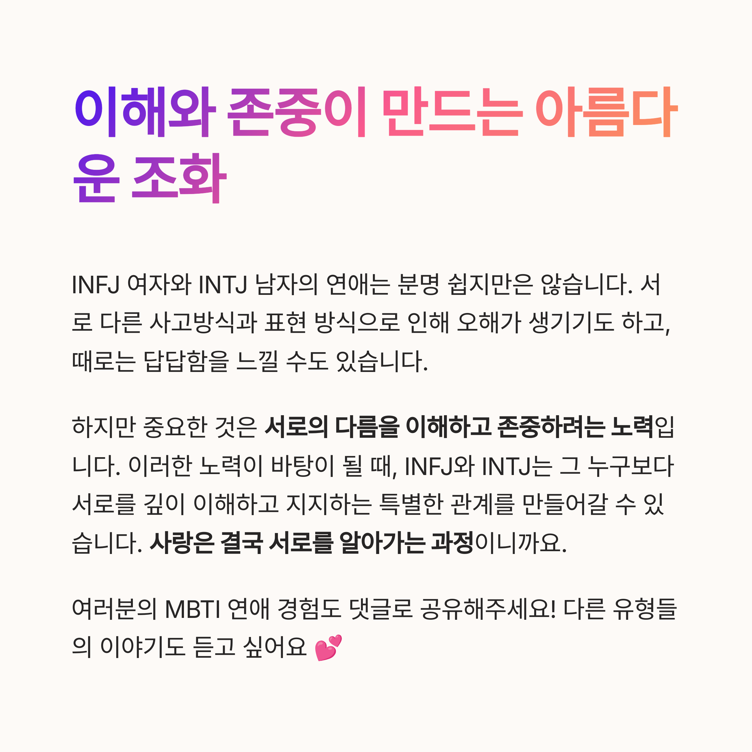이러한 노력이 바탕이 될 때, INFJ와 INTJ는 그 누구보다 서로를 깊이 이해하고 지지하는 특별한 관계를 만들어갈 수 있습니다.