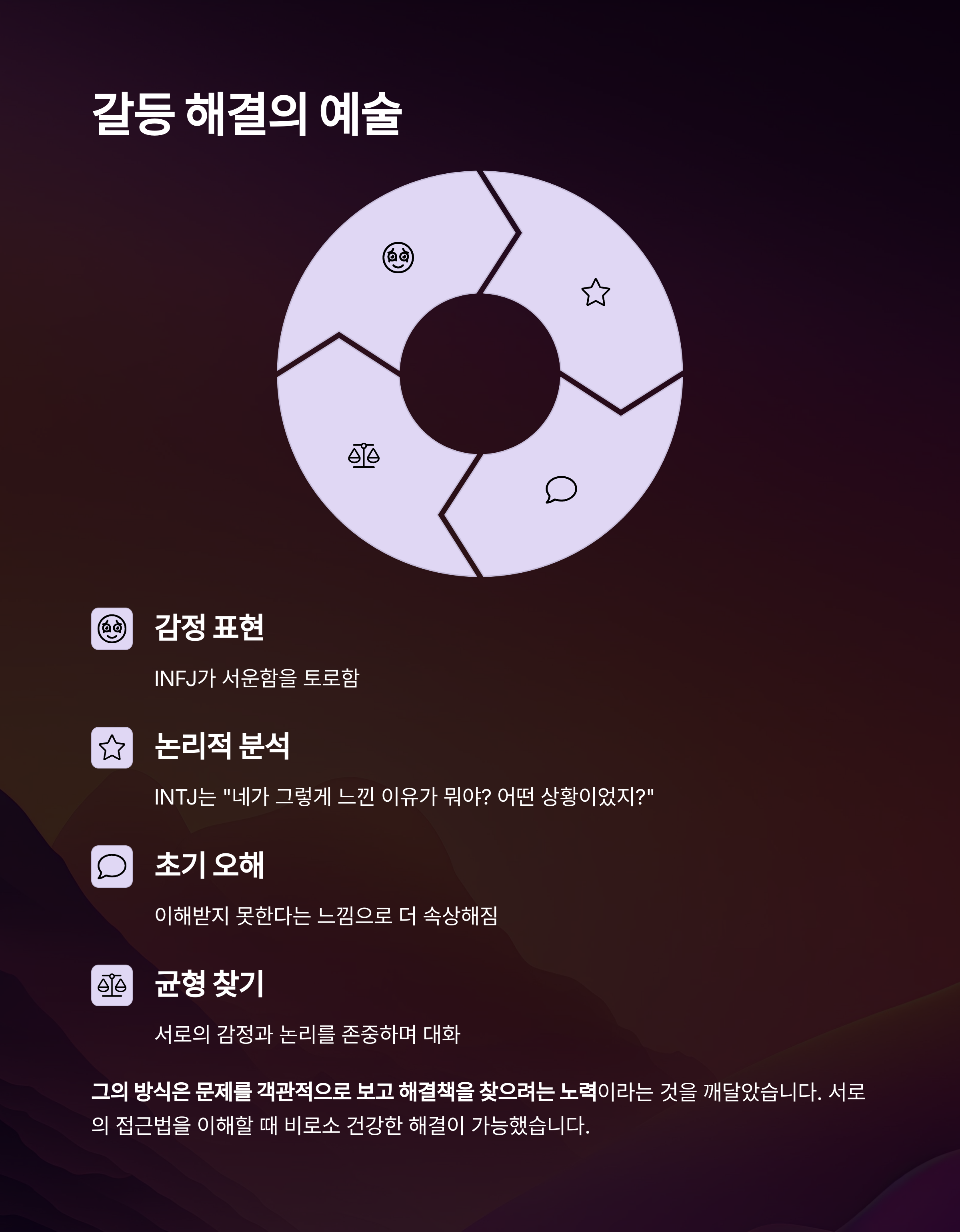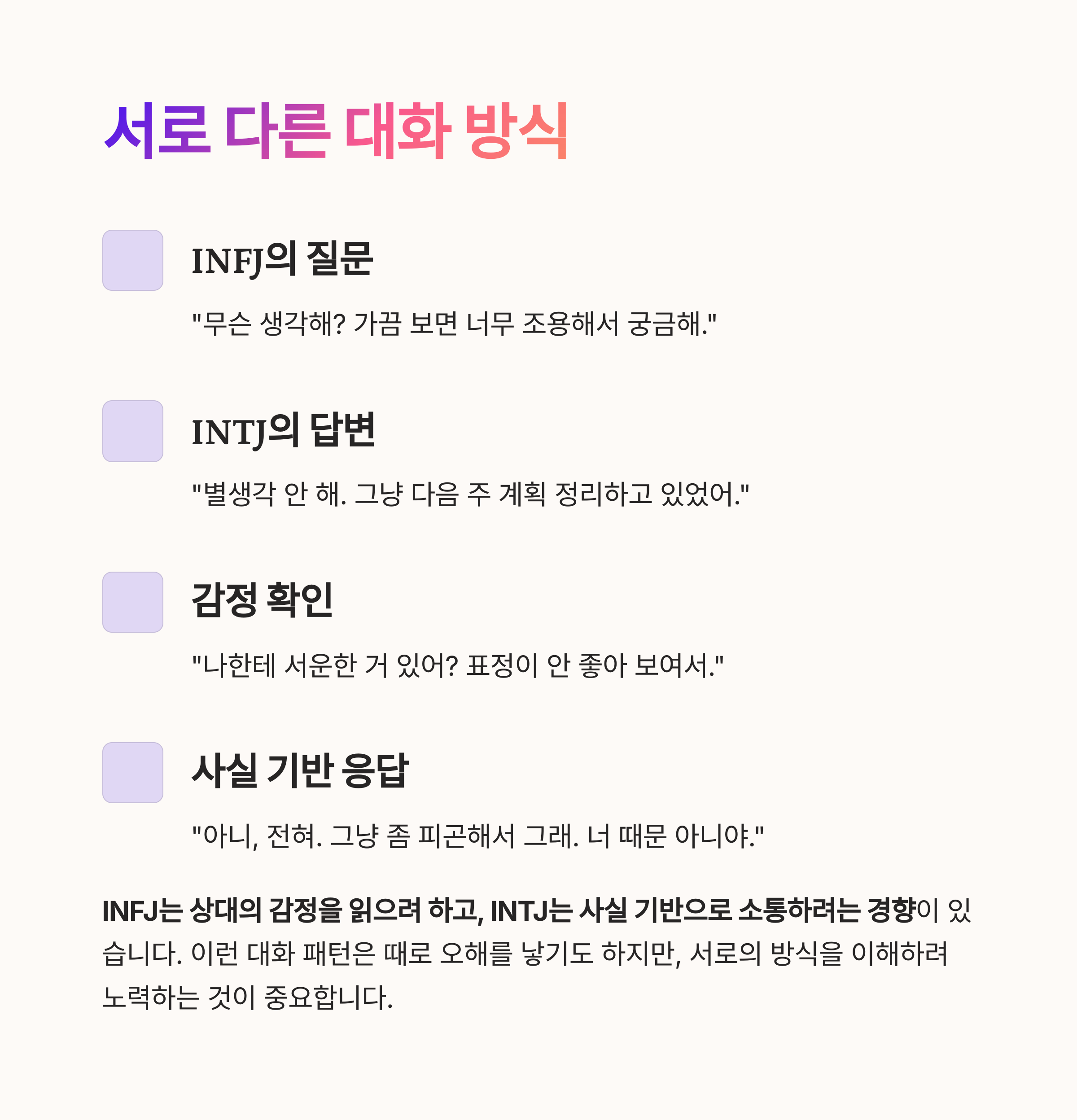 이처럼 INFJ는 상대의 감정을 읽으려 하고, INTJ는 사실 기반으로 소통하려는 경향이 있습니다.
