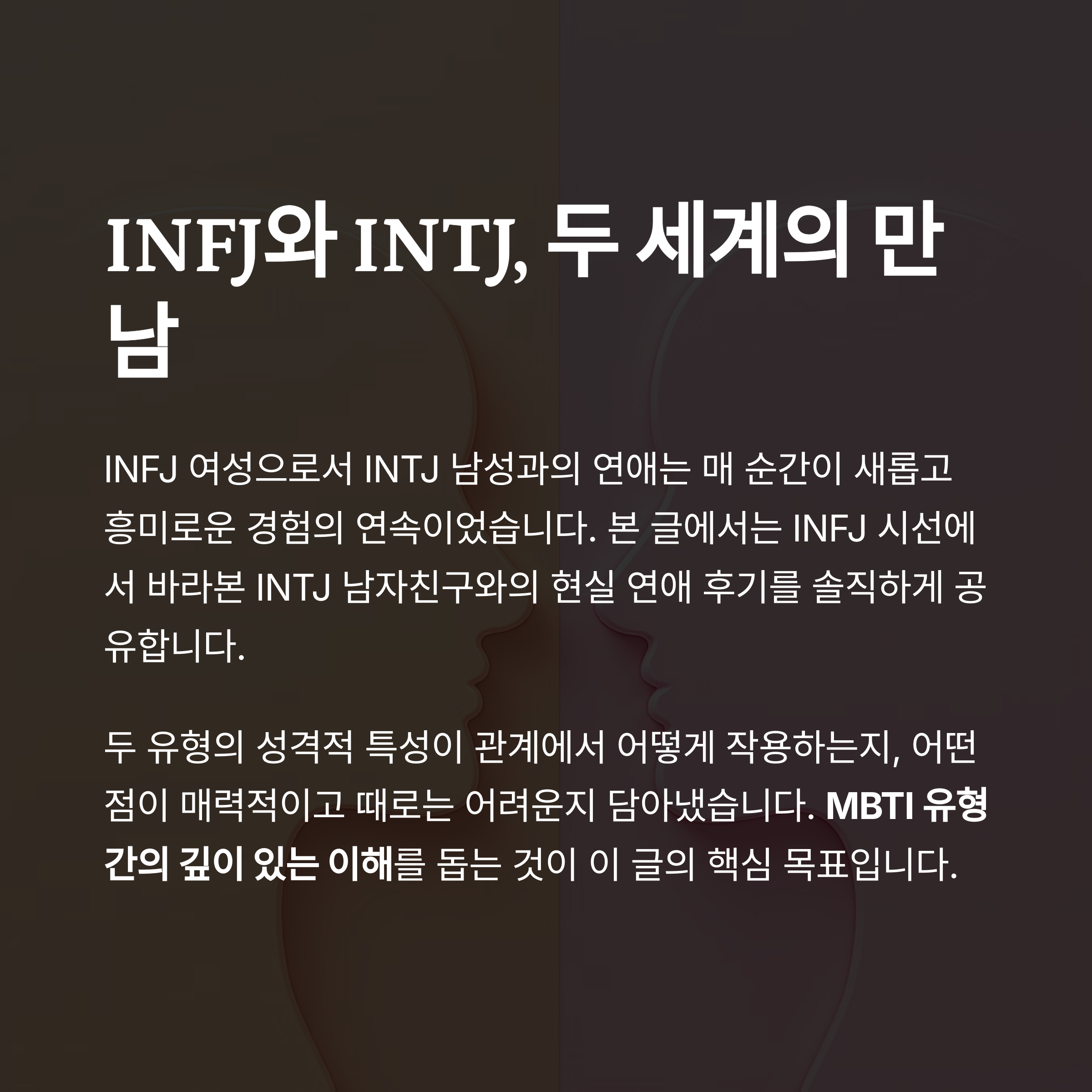 INFJ 여성으로서 INTJ 남성과의 연애는 매 순간이 새롭고 흥미로운 경험의 연속이었습니다.