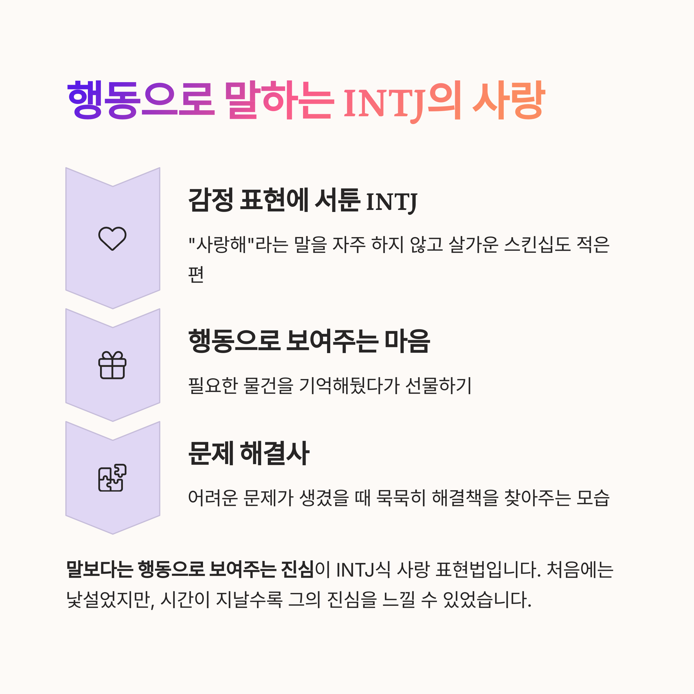 말보다는 행동으로 보여주는 진심이 INTJ식 사랑 표현법인 것 같습니다.
