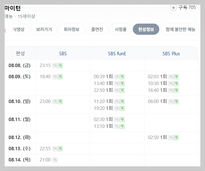 - SBS: 8/8(금) 23:15 │ 8/9(토) 18:40 │ 8/10(일) 23:00